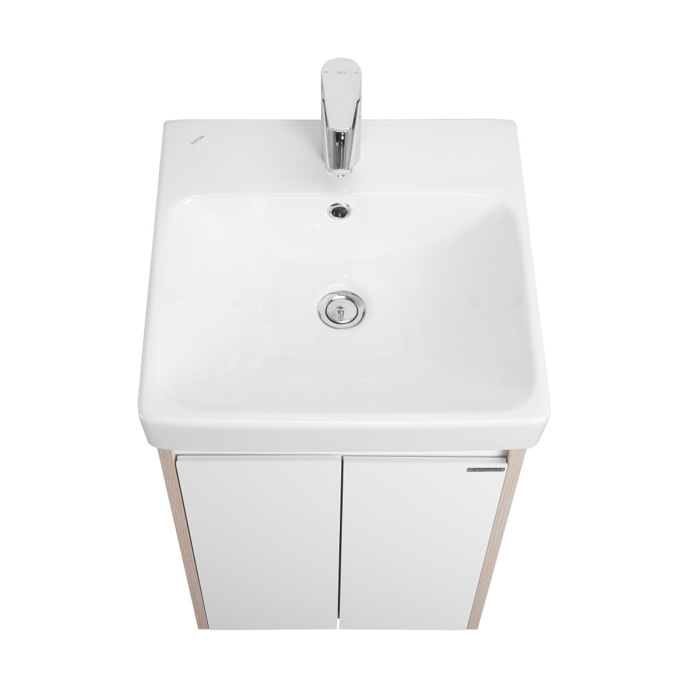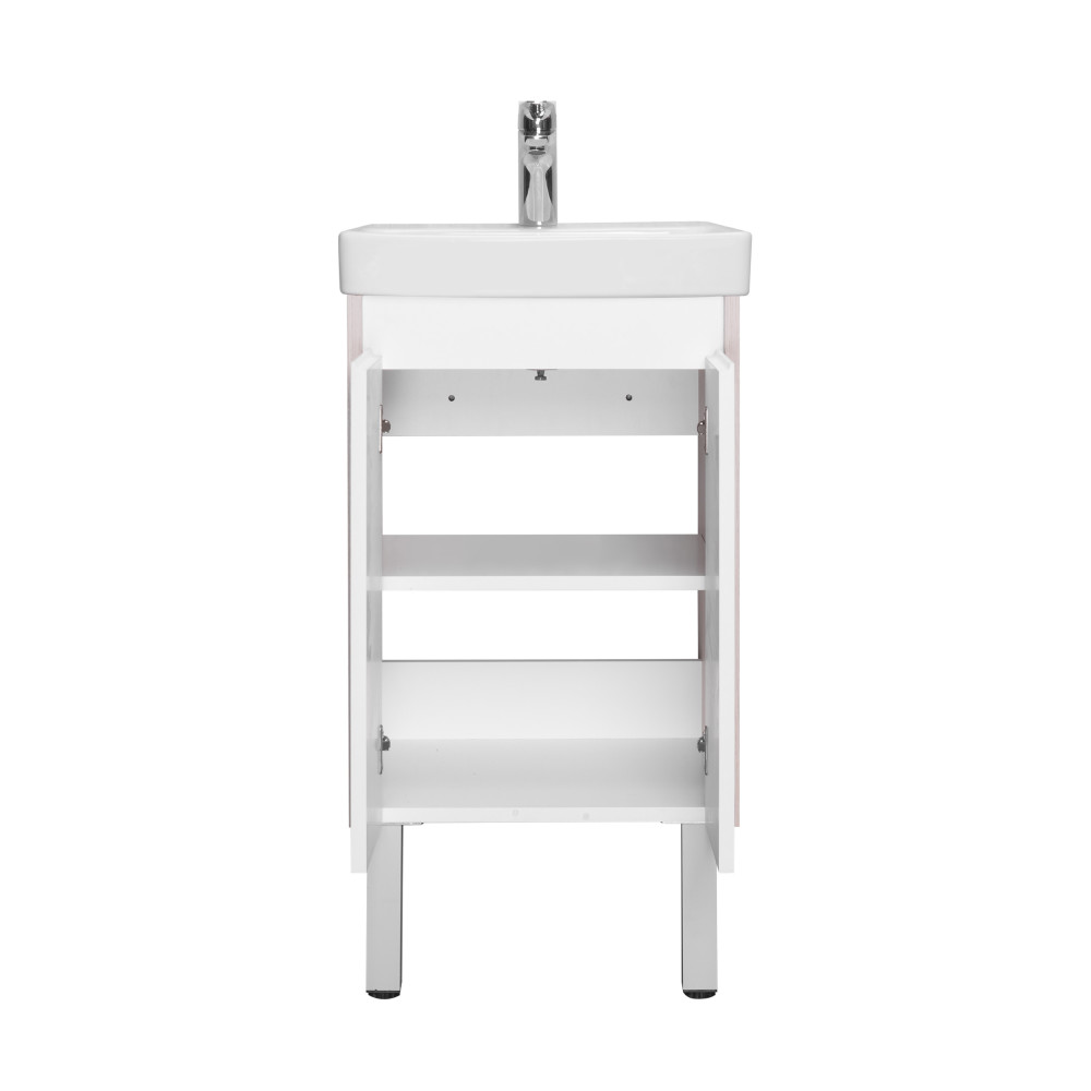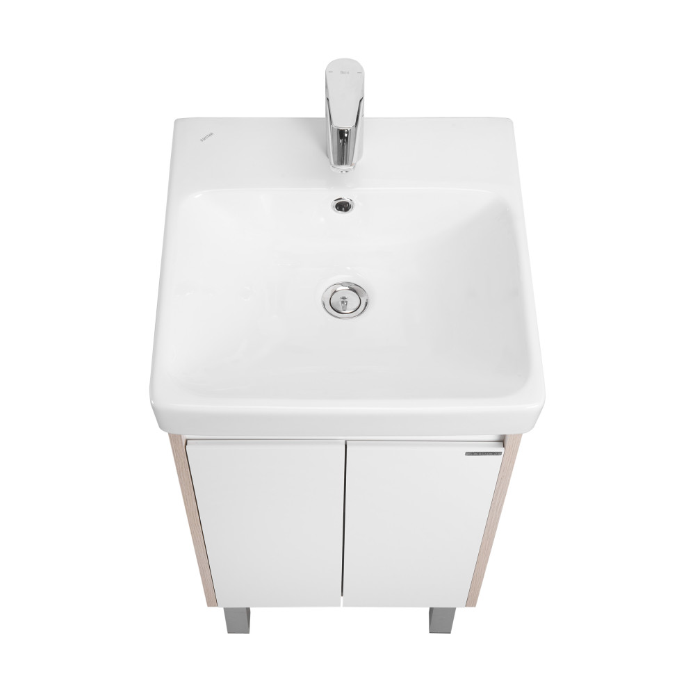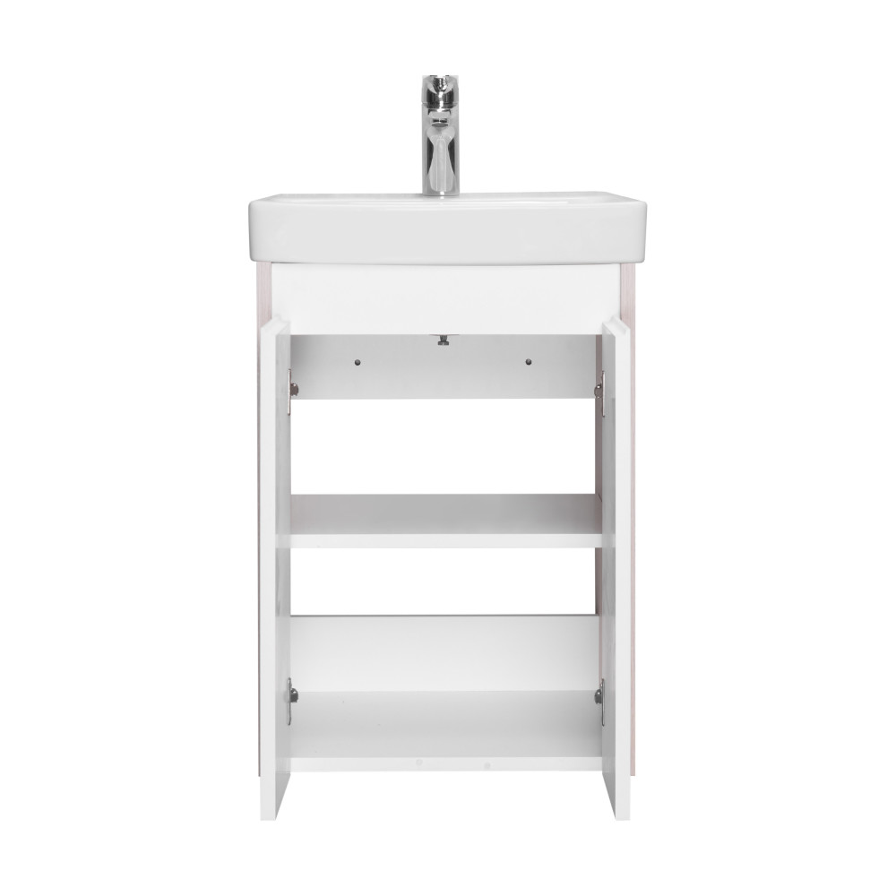 Тумба Сканди Doors 45 выполнена в популярном минималистичном скандинавском стиле. Корпус тумбы выполнен из влагостойкой ЛДСП в декоре натурального дерева, а фасады-створки в белой глянцевой покраске. За створками скрывается вместительное пространство, разделенное на две части регулируемой по высоте полкой из ВЛДСП. На тумбе нет выступающих деталей и фурнитуры, открытие створок реализуется за фасад, верхняя часть которого обработана под ручку J-профиль. К тумбе идеально подходит белоснежная раковина Адриана от бренда Santek. Раковина продается отдельно