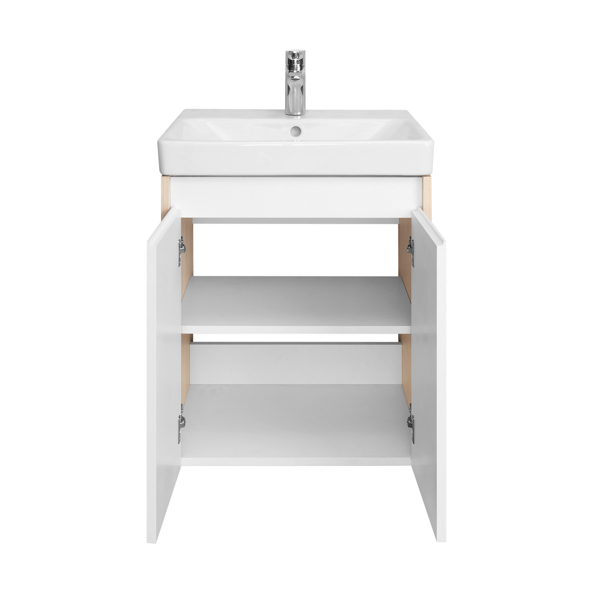 Тумба Сканди Doors 55 выполнена в популярном минималистичном скандинавском стиле. Корпус тумбы выполнен из влагостойкой ЛДСП в декоре натурального дерева, а фасады-створки в белой глянцевой покраске. За створками скрывается вместительное пространство, разделенное на две части регулируемой по высоте полкой из ВЛДСП. На тумбе нет выступающих деталей и фурнитуры, открытие створок реализуется за фасад, верхняя часть которого обработана под ручку J-профиль. К тумбе идеально подходит белоснежная раковина Адриана от бренда Santek. "Адриана" - это новая линейка раковин, которая учитывает основные современные тенденции дизайна, требования потребителя и удобства ванной комнаты. Раковины предназначены для установки на тумбу. Лаконичный бортик может быть использовать для аксессуаров. Широкий размерный ряд позволяет использовать умывальники в ванных комнатах разной площади