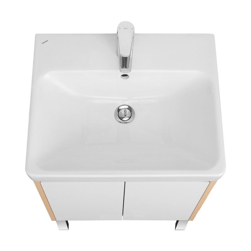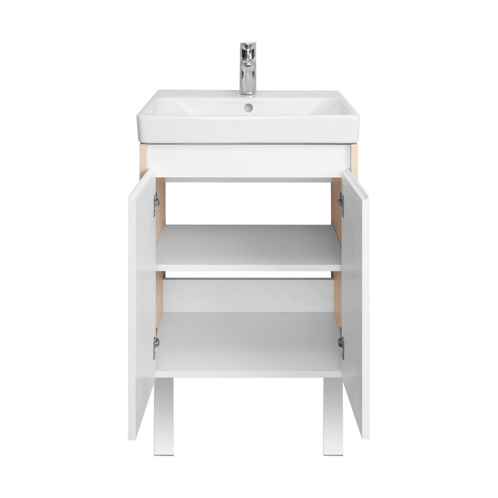 Тумба Сканди Doors 55 выполнена в популярном минималистичном скандинавском стиле. Корпус тумбы выполнен из влагостойкой ЛДСП в декоре натурального дерева, а фасады-створки в белой глянцевой покраске. За створками скрывается вместительное пространство, разделенное на две части регулируемой по высоте полкой из ВЛДСП. На тумбе нет выступающих деталей и фурнитуры, открытие створок реализуется за фасад, верхняя часть которого обработана под ручку J-профиль. К тумбе идеально подходит белоснежная раковина Адриана от бренда Santek. Раковина продается отдельно