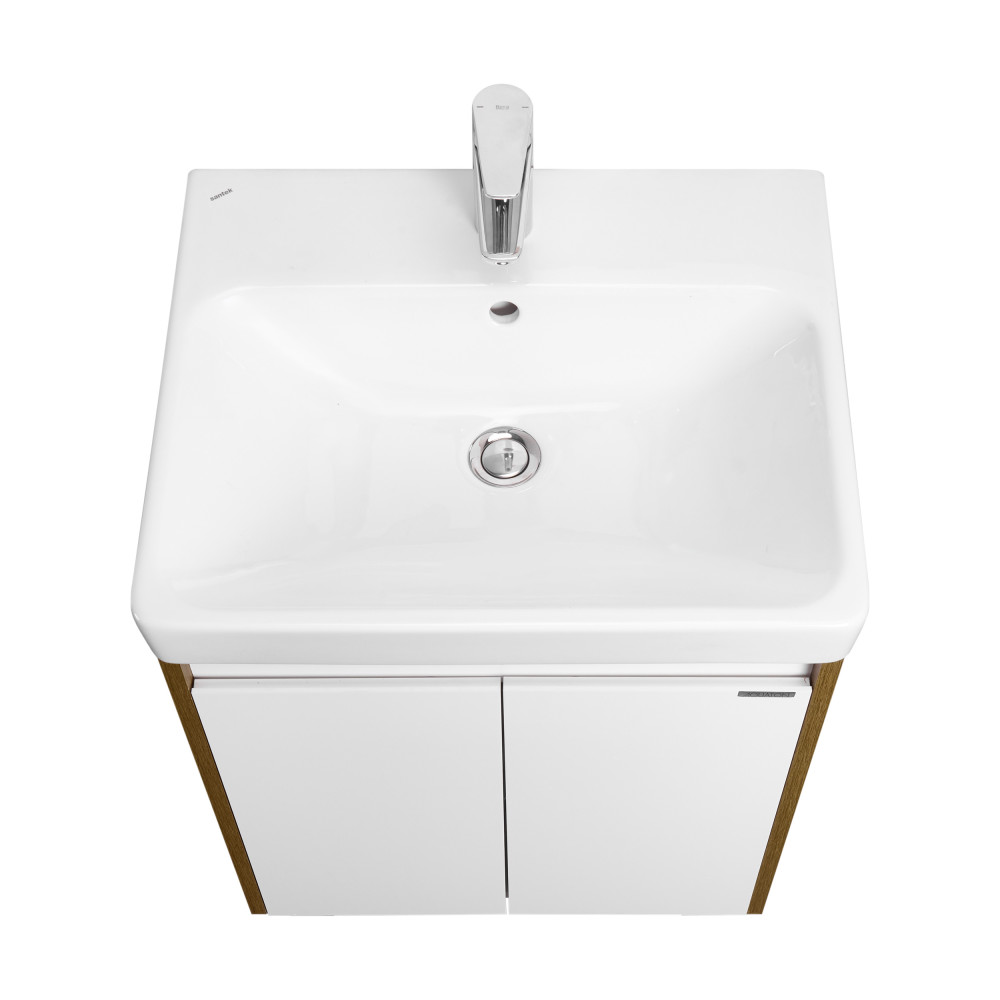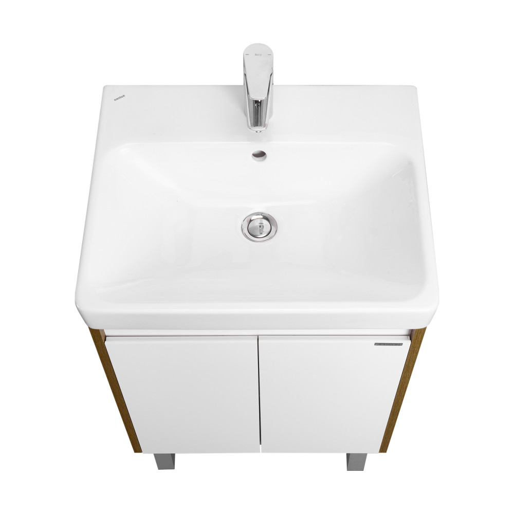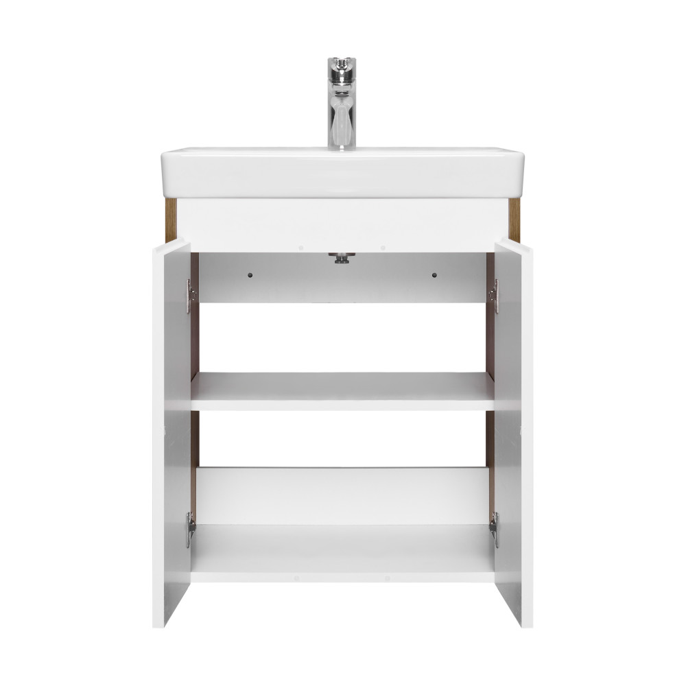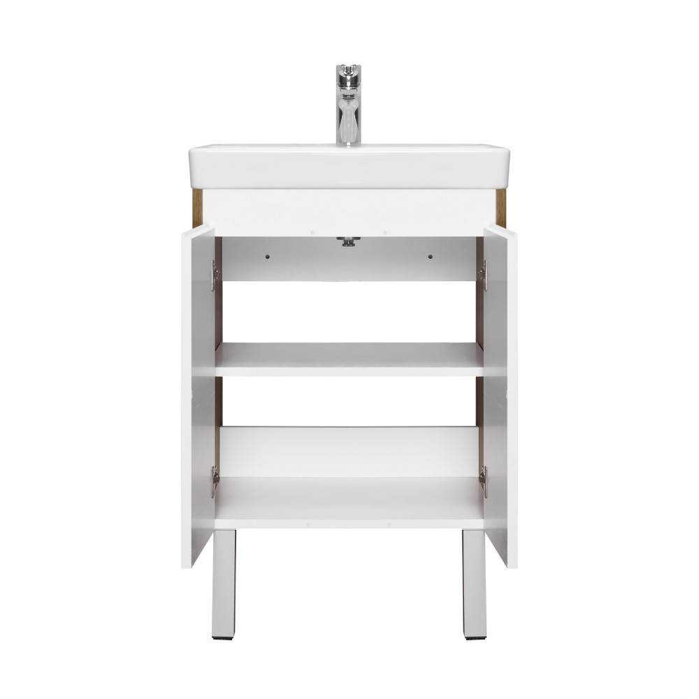 Тумба Сканди Doors 55 выполнена в популярном минималистичном скандинавском стиле. Корпус тумбы выполнен из влагостойкой ЛДСП в декоре натурального дерева, а фасады-створки в белой глянцевой покраске. За створками скрывается вместительное пространство, разделенное на две части регулируемой по высоте полкой из ВЛДСП. На тумбе нет выступающих деталей и фурнитуры, открытие створок реализуется за фасад, верхняя часть которого обработана под ручку J-профиль. К тумбе идеально подходит белоснежная раковина Адриана от бренда Santek. Раковина продается отдельно