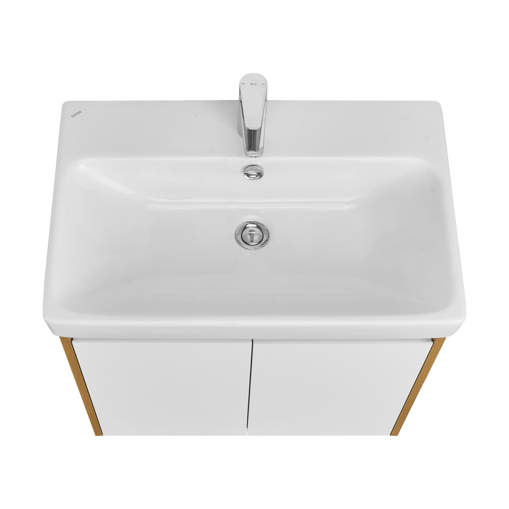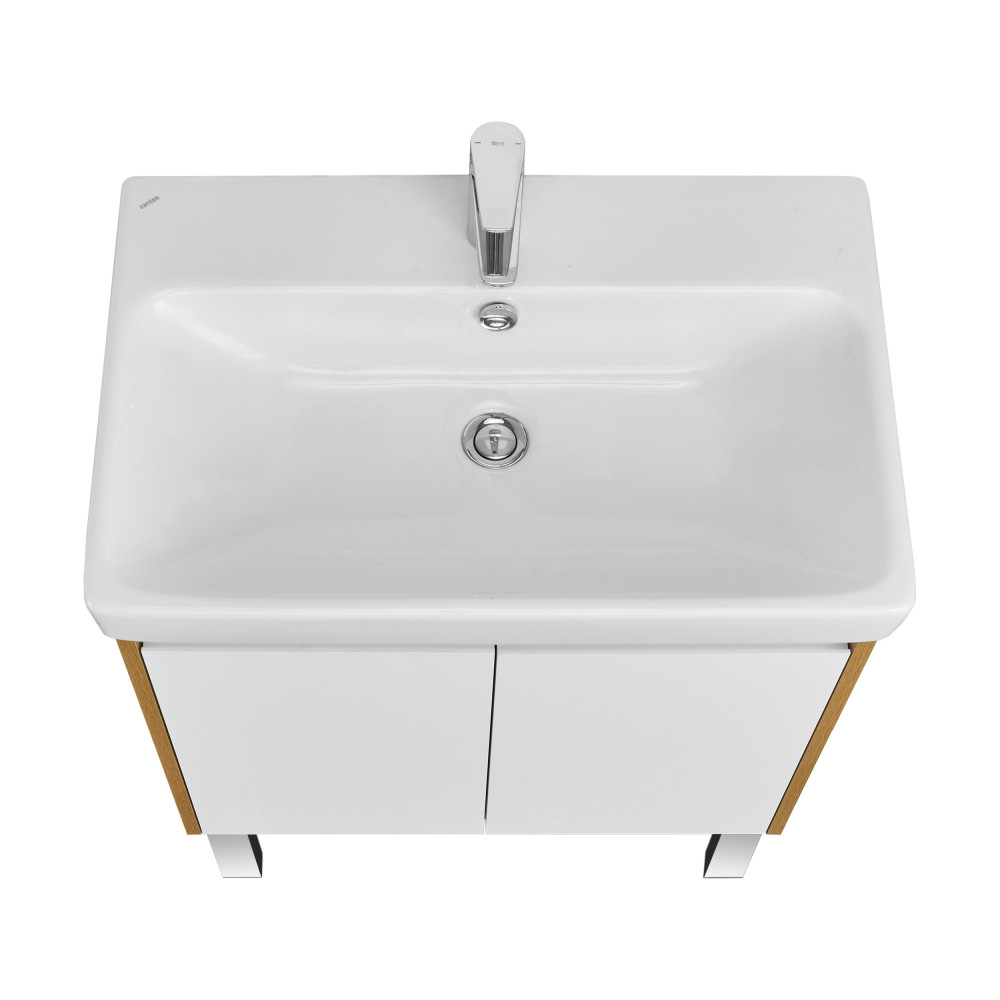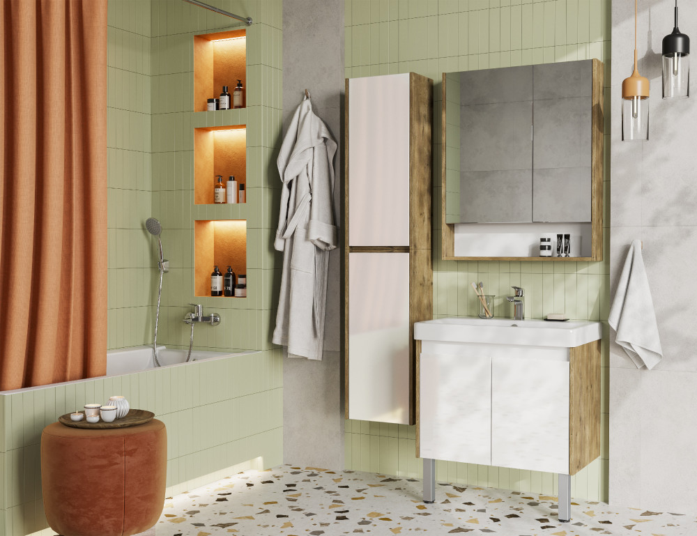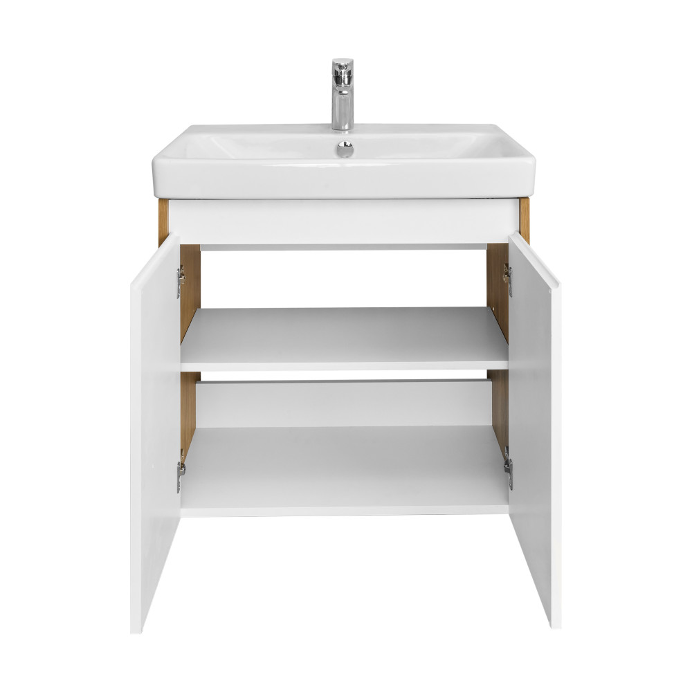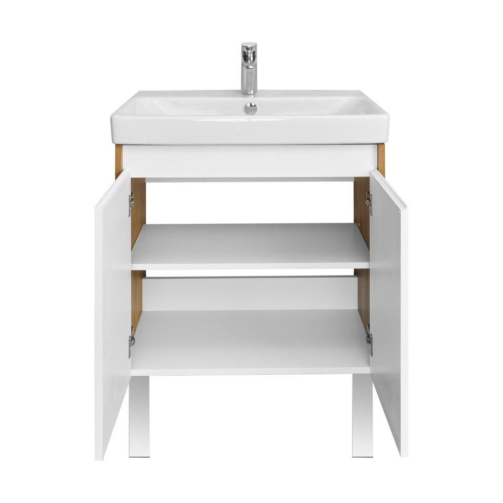 Тумба Сканди Doors 70 выполнена в популярном минималистичном скандинавском стиле. Корпус тумбы выполнен из влагостойкой ЛДСП в декоре натурального дерева, а фасады-створки в белой глянцевой покраске. За створками скрывается вместительное пространство, разделенное на две части регулируемой по высоте полкой из ВЛДСП. На тумбе нет выступающих деталей и фурнитуры, открытие створок реализуется за фасад, верхняя часть которого обработана под ручку J-профиль. К тумбе идеально подходит белоснежная раковина Адриана от бренда Santek. Раковина продается отдельно