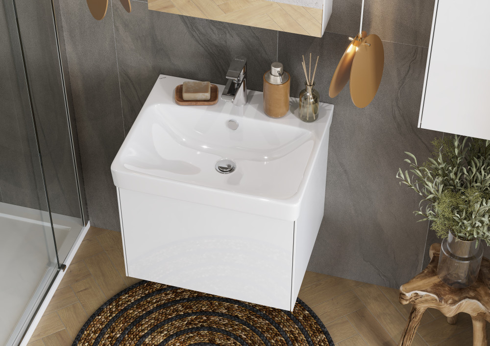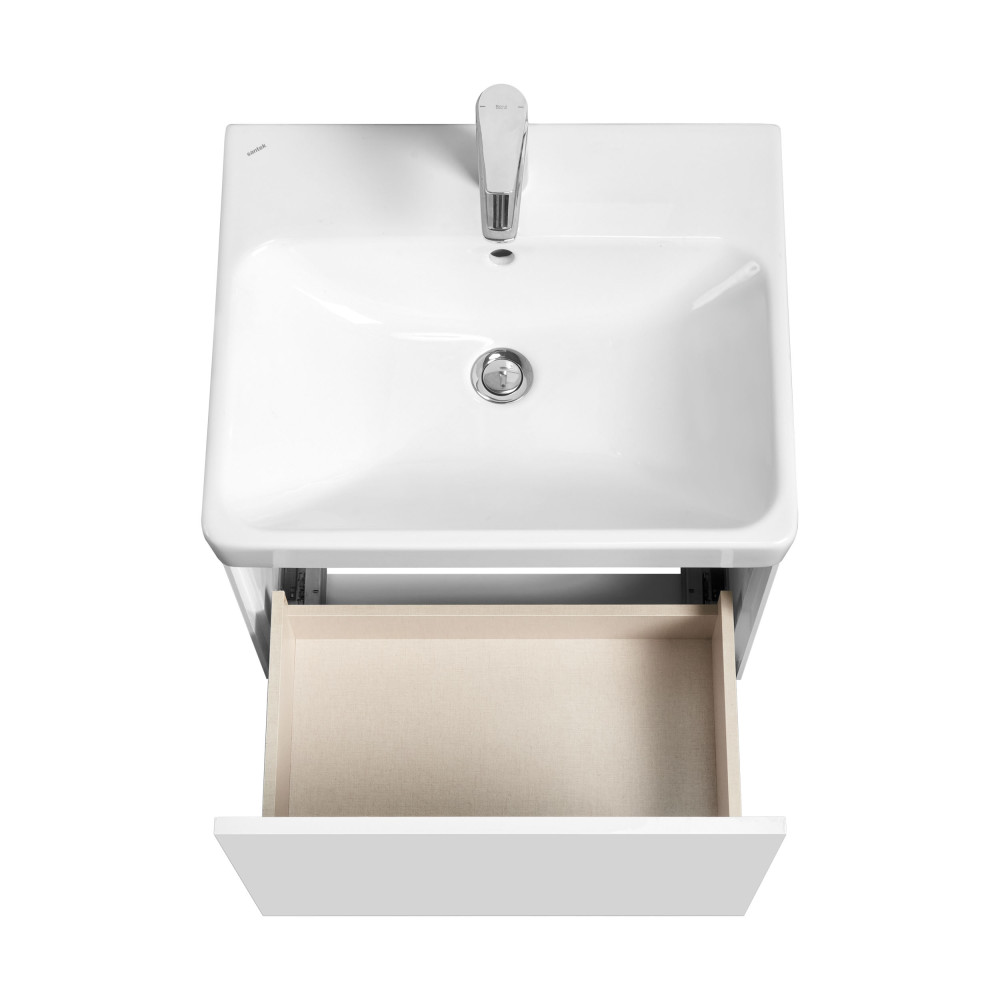 Боковые стенки тумбы под раковину АСТИ 55 выполнены из влагостойкой ЛДСП в матовой покраске, фасад тумбы из влагостойкой ДСП в белой глянцевой покраске. Трендовое сочетание двух текстур позволит интересно обыграть классический белый цвет и разнообразить мебелью АСТИ дизайн любой ванной комнаты. Ящик тумбы оснащен механизмом Push-to-Open, гарантирующим плавное открывание и закрывание. Внутренняя отделка ящика выполнена в цвете лён: приятная на ощупь и предотвращает скольжение предметов. Отличительная особенность мебели из коллекции - боковые стенки, при изготовлении которых используется особая инновационная технология. Благодаря ей создается эффект визуально тонких боковых линий, однако конструкция при этом остается надежной и прочной. Пространство для хранения в ящике тумбы можно организовать так, как удобно именно вам. Тумбы АСТИ комбинируются с раковиной Адриана бренда Santek