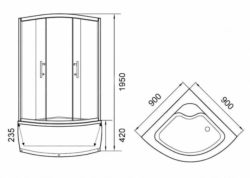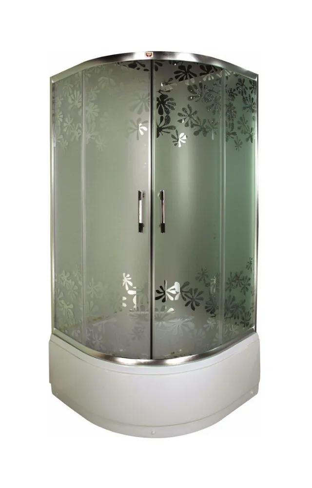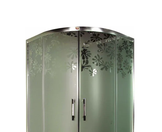 В модели красиво сочетается алюминиевый матовый профиль и матовое стекло с цветочным рисунком. Закругленная форма уголка экономит место в ванной комнате. При этом внутри душевой зоны достаточно комфортно