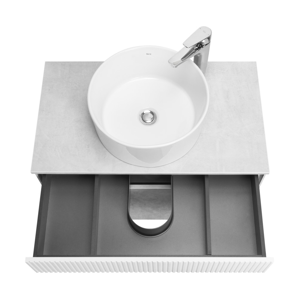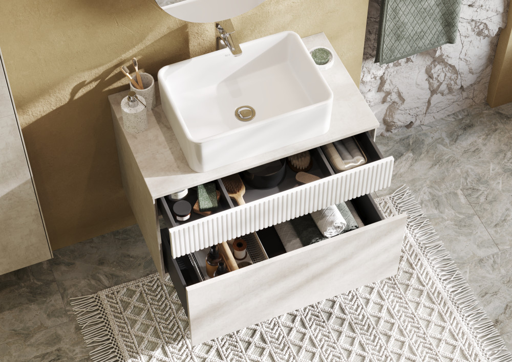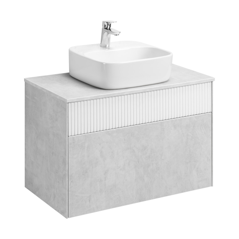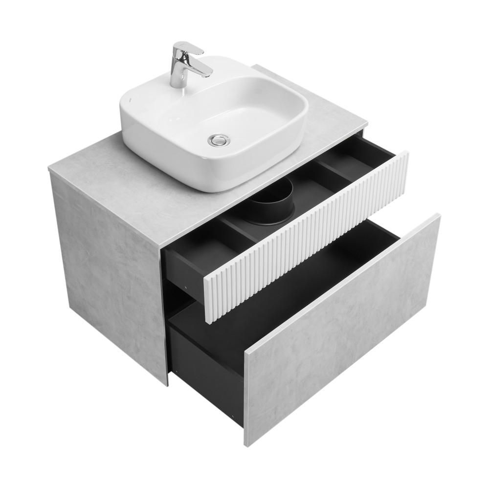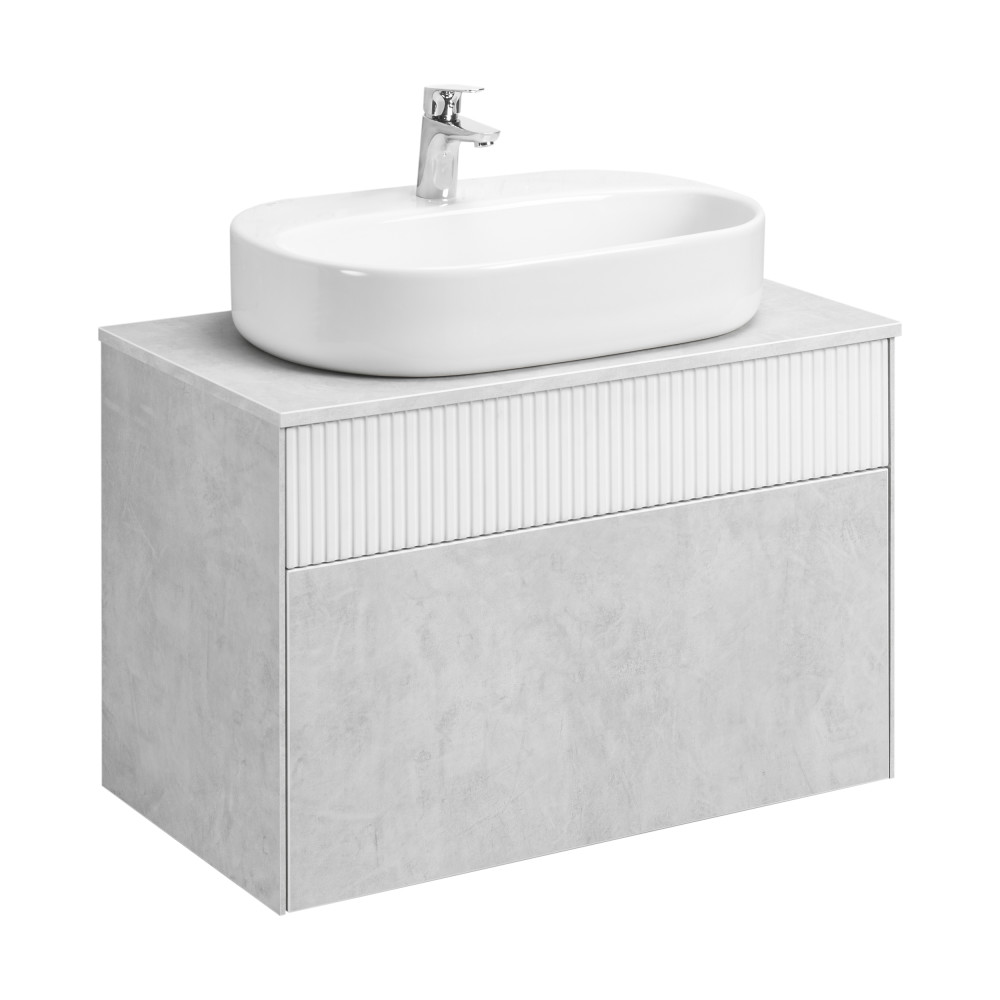 Тумба Марбл 80 функционально состоит из двух вместительных ящиков, оснащенных системой push to open, обеспечивающей надежное, комфортное и бесшумное закрывание. Дополнительно предусмотрены 2 регулируемые планки для внутренней организации пространства. Верхний фасад изделия выполнен из МДФ с реечной фрезеровкой в белой матовой пленке с эффектом soft touch, а нижний фасад и корпус из ламинированной влагостойкой ДСП Слэйт. Верхний и нижний ящики позволяют содержать косметические средства в идеальном порядке. Тумба комплектуется различными по форме накладными раковинами: Santek Одри Soft, Santek Одри Round, Aquaton Лола, Roca Mila круглая и Roca Mila прямоугольная. Раковины продаются отдельно