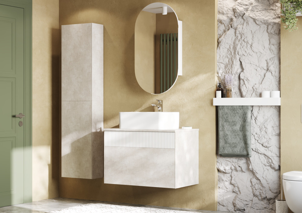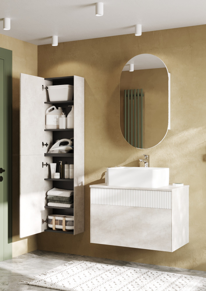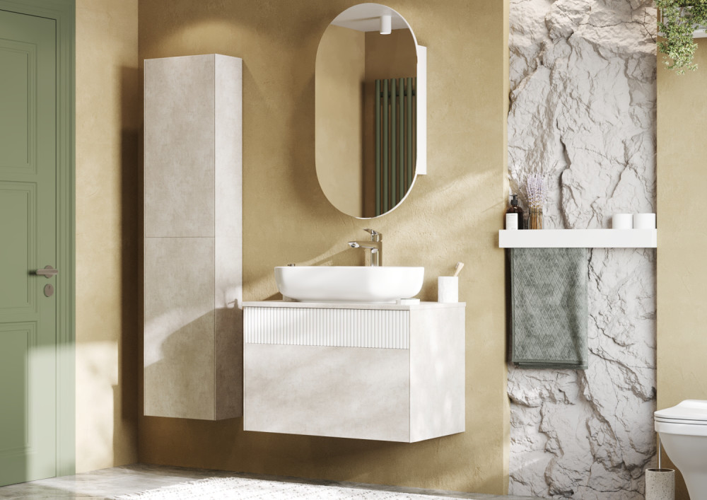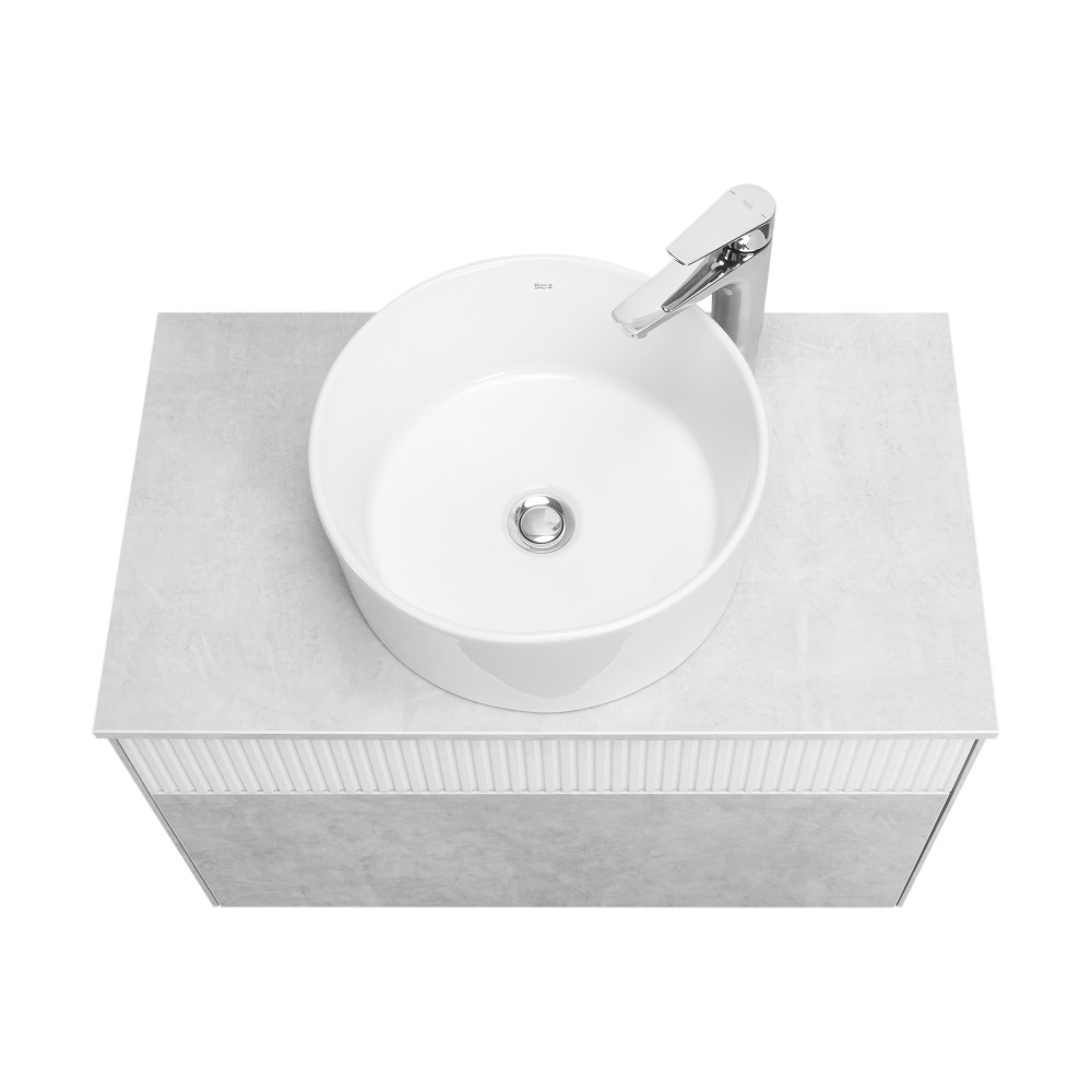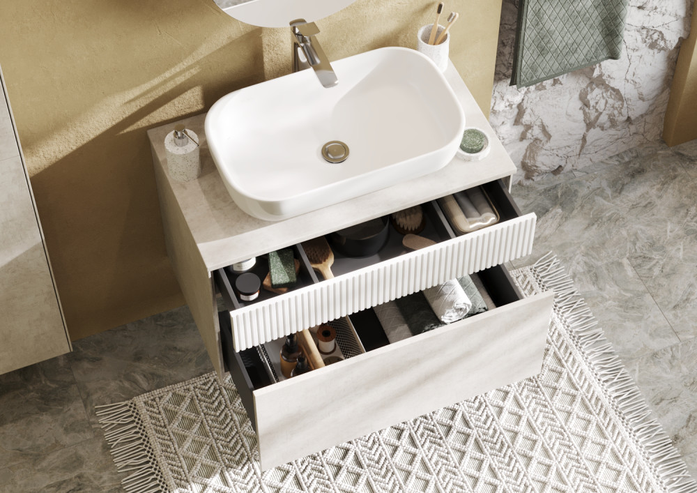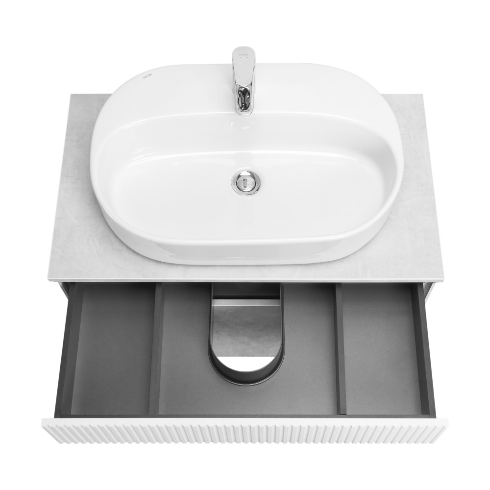 Тумба Марбл 80 функционально состоит из двух вместительных ящиков, оснащенных системой push to open, обеспечивающей надежное, комфортное и бесшумное закрывание. Дополнительно предусмотрены 2 регулируемые планки для внутренней организации пространства. Верхний фасад изделия выполнен из МДФ с реечной фрезеровкой в белой матовой пленке с эффектом soft touch, а нижний фасад и корпус из ламинированной влагостойкой ДСП Слэйт. Верхний и нижний ящики позволяют содержать косметические средства в идеальном порядке. Тумба комплектуется различными по форме накладными раковинами: Santek Одри Soft, Santek Одри Round, Aquaton Лола, Roca Mila круглая и Roca Mila прямоугольная. Раковины продаются отдельно