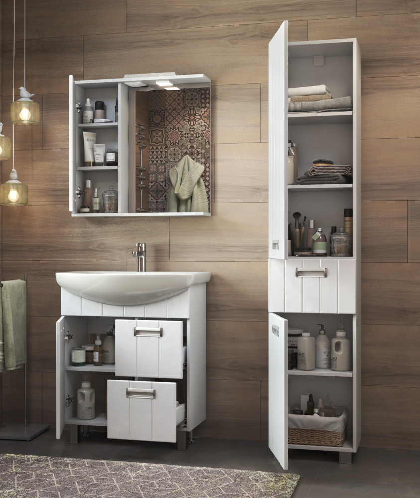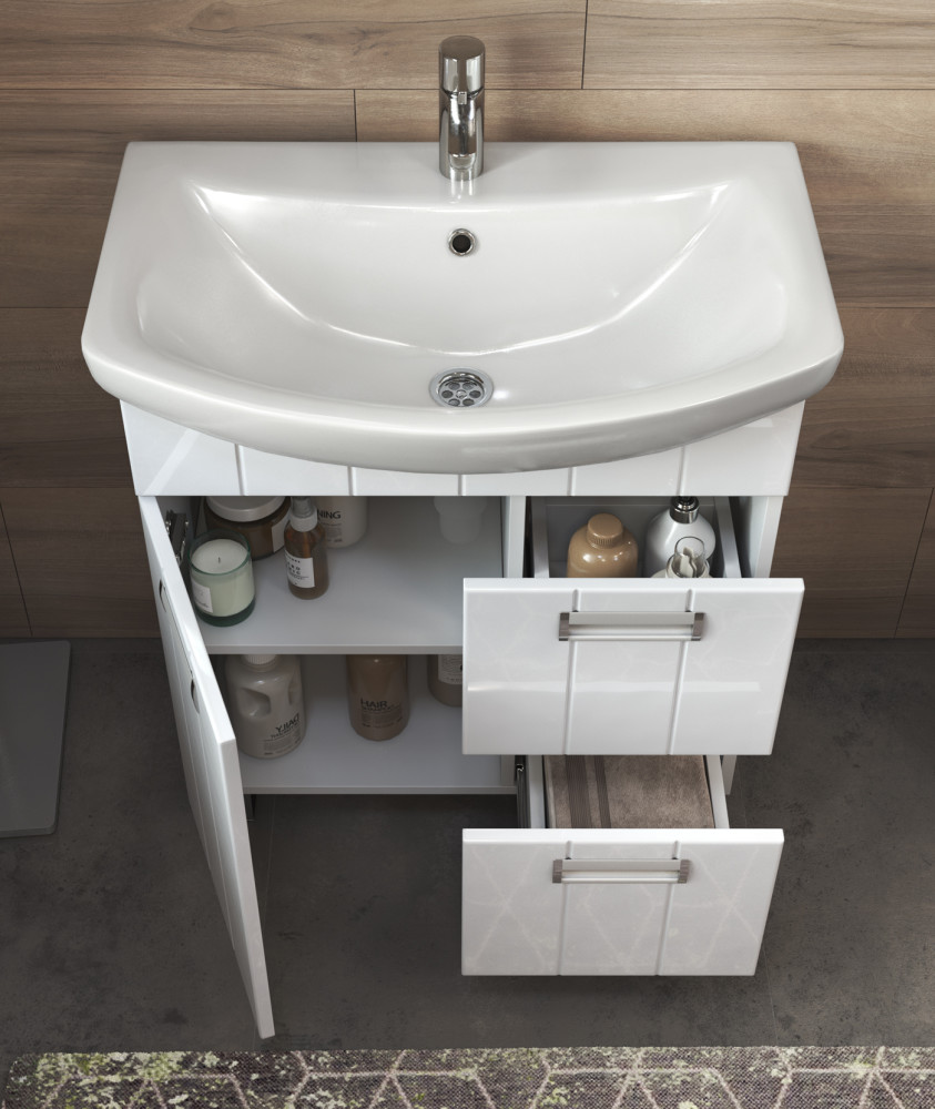 -Комплектация: 1 дверца, 2 выдвижных ящика (полного выдвижения), 1 полка ЛДСП, металлическая хромированная ручка, регулируемые квадратные опоры