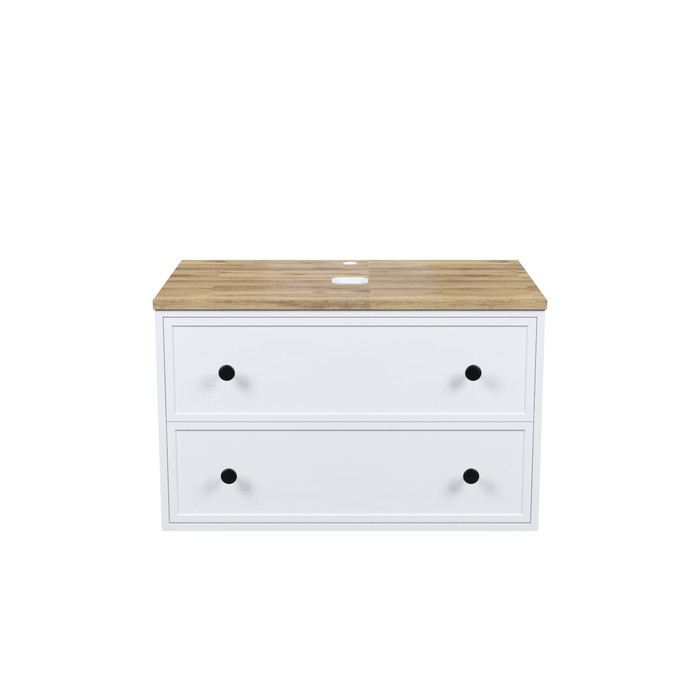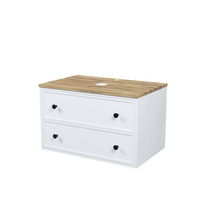 Вместительная подвесная тумба Torr классического молочно-белого цвета со столешницей из клееного натурального дуба. Сочетает в себе узнаваемый стиль и практичность популярного скандинавского дизайна. Ее четкие формы, теплый цвет дерева, фасады с декоративной филенкой, круглые ручки смотрятся гармонично и впишутся в любой современный интерьер. Подойдет любой накладной умывальник, покупается отдельно.