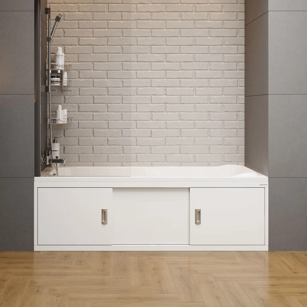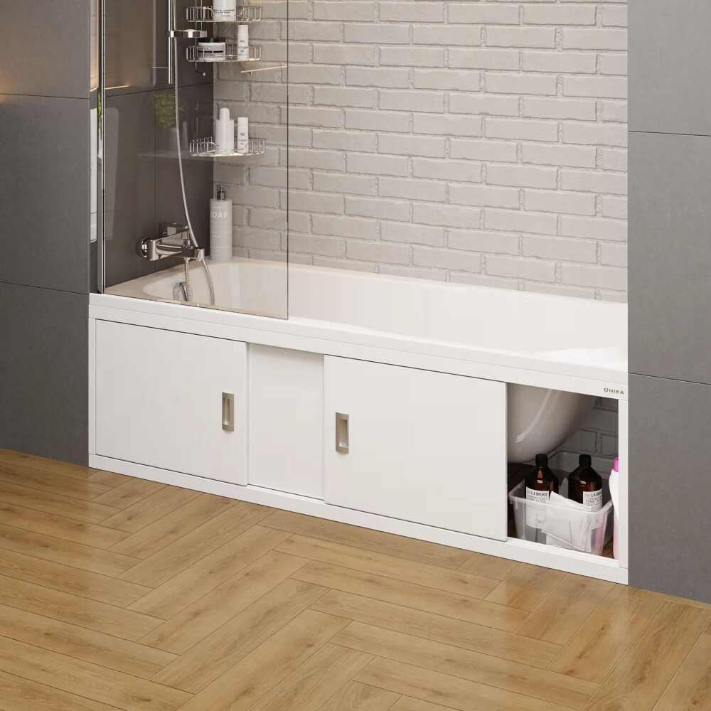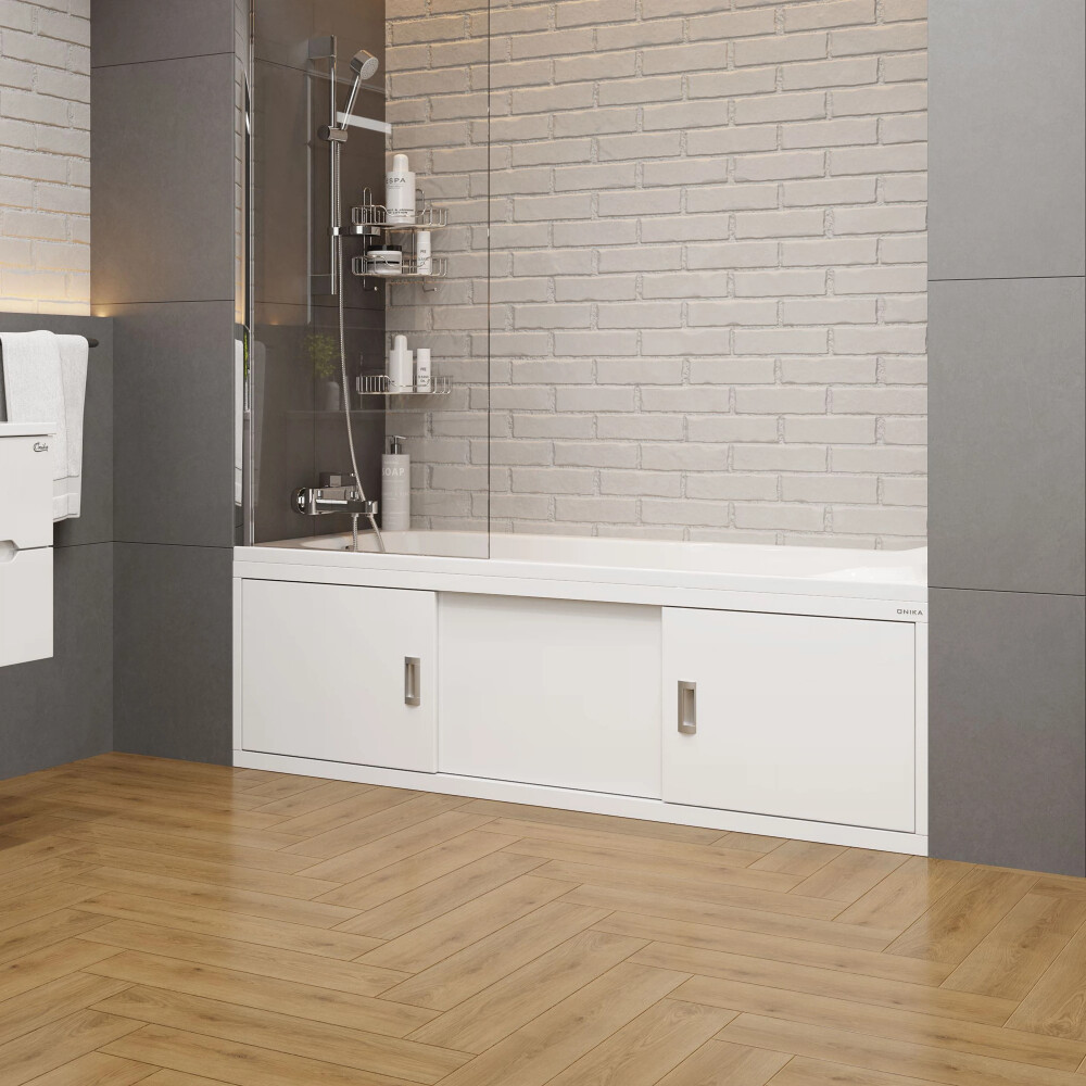 Универсальный экран под ванну Onika Монако 170 белый - это стильное и практичное решение для скрытия коммуникаций под ванной и создания дополнительного места для хранения.Усиленная рама по всему периметру экрана выполнена из алюминия и окрашена в белый цвет. Конструкция имеет три подвижные раздвижные двери из МДФ, покрытых высокоглянцевой белой пленкой. Две боковые дверцы с врезными хромированными металлическими ручками. Установка враспор между ванной и полом делает конструкцию особо устойчивой и прочной, а процесс установки максимально простым и удобным: экран можно легко установить своими руками без специальных приспособлений.Ножки позволяют регулировать экран по высоте от 51 до 60 см, благодаря этому экран является универсальным, возможность регулировки по высоте позволяет идеально подогнать панель под ванну. Экран подходит для большинства стандартных ванн шириной до 1,7 м
