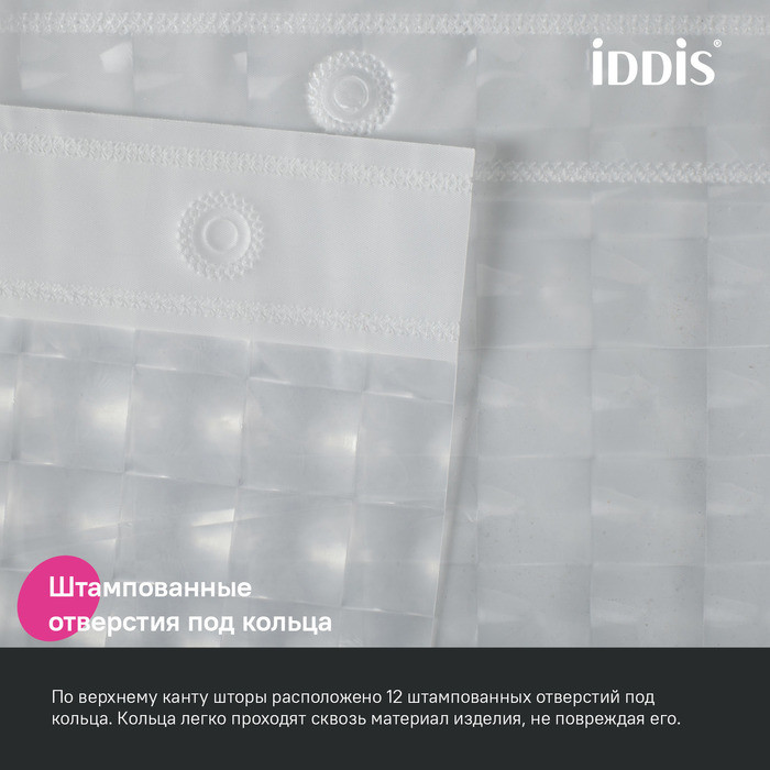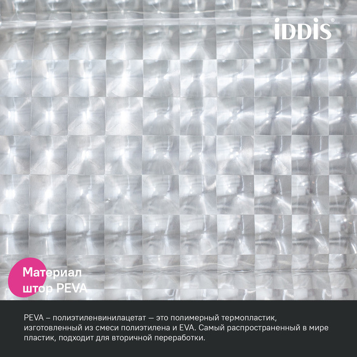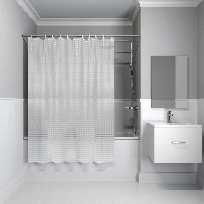 Полупрозрачная 3D-штора для ванной с рисунком из маленьких квадратов. Изготовлена из современного материала PEVA – мягкого, приятного на ощупь, экологичного и безвредного для здоровья термопластика (толщина 0,13 мм).