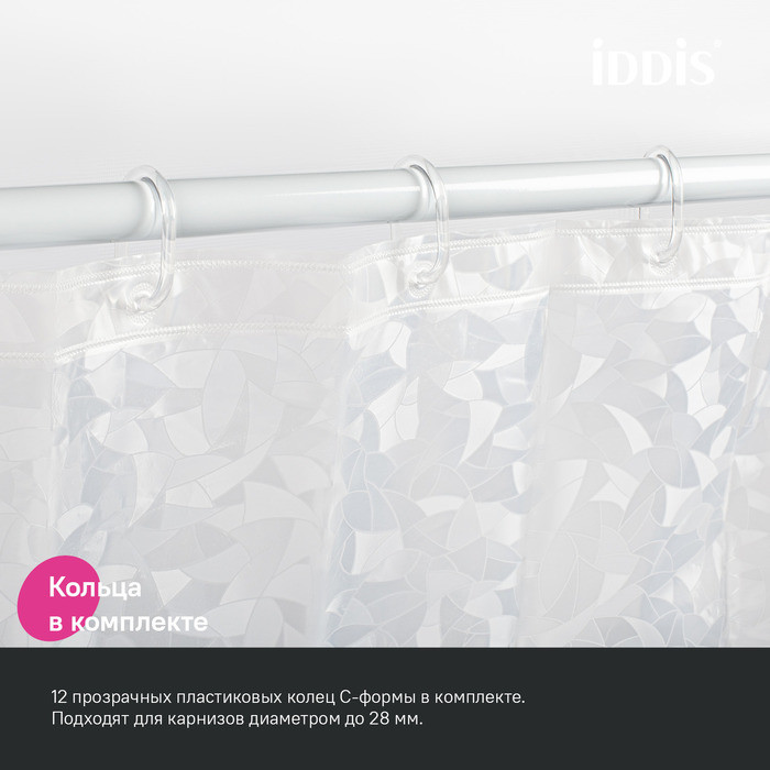 Полупрозрачная 3D-штора для ванной с витражным рисунком. Изготовлена из современного материала PEVA – мягкого, приятного на ощупь, экологичного и безвредного для здоровья термопластика (толщина 0,13 мм).•Без неприятного запаха, благодаря чему шторку для ванной можно использовать уже в день покупки.•В комплекте 12 прозрачных пластиковых колец С-формы.•По верхнему краю 12 штампованных отверстий-люверсов – кольцо/крючок легко пройдет насквозь, не повредив шторы.•Материал PEVA на 100% водонепроницаем и надежно защищает от брызг, не подвержен развитию плесени и грибка.•Просто ухаживать: достаточно протереть салфеткой с мылом и промыть под душем. При этом штору можно даже не снимать с карниза.Гарантия на штору на текстильные аксессуары IDDIS® – 1 год.(с) Авторский текст, июнь 2023 г
