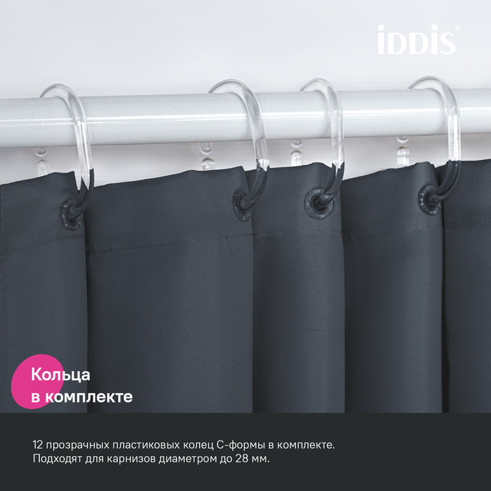 •Изготовлена из износостойкого полиэстера с водоотталкивающей пропиткой. При попадании на ткань вода не впитывается, а скатывается каплями, даже при сильном напоре воды. •В комплекте 12 колец С-формы из прозрачного пластика.