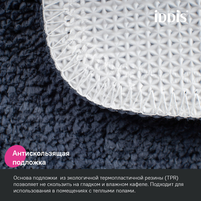 Мягкий коврик для ванной глубокого синего цвета с плотным невысоким ворсом (1 см), очень приятный на ощупь. Ворс из микрофибры отлично держит форму, легко чистится и быстро сохнет. Коврик подойдет для ванной и туалета. •Этот коврик в ванную противоскользящий: основа из экологичной термопластичной резины (TPR) позволяет не скользить на гладком и влажном кафеле. Подходит для использования в помещениях с теплыми полами. •Благодаря современным влагостойким материалам и качественной обработке краев коврик не потеряет яркости красок, не обветшает и надолго останется привлекательным как в день покупки.•Несложно ухаживать: разрешена деликатная стирка при температуре до 40оС с жидким моющим средством; не сушить на батарее, избегать солнечных лучей.Гарантия на текстильные аксессуары IDDIS® – 1 год. (с) Авторский текст, июнь 2023 г