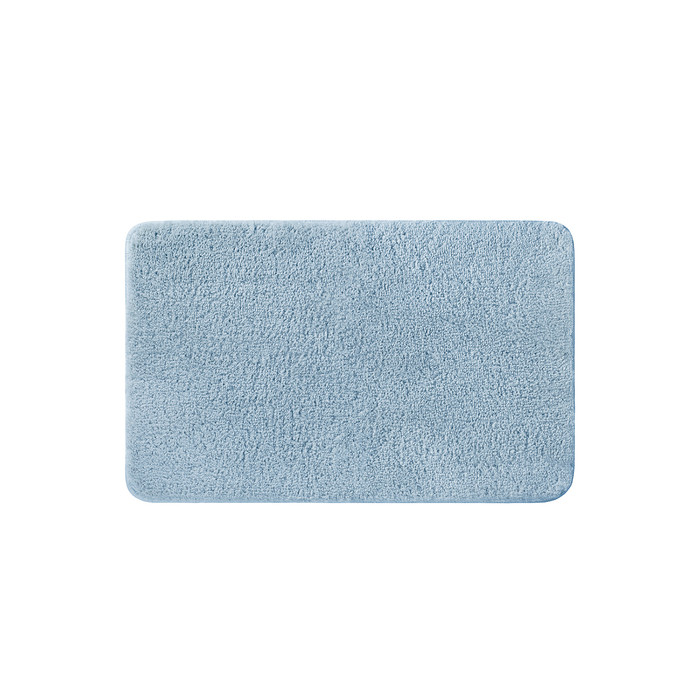 Мягкий коврик для ванной светло-синего цвета с плотным высоким ворсом (2 см), очень приятный на ощупь. Стриженый ворс из микрофибры отлично держит форму, легко чистится и быстро сохнет. Коврик подойдет для ванной и туалета.