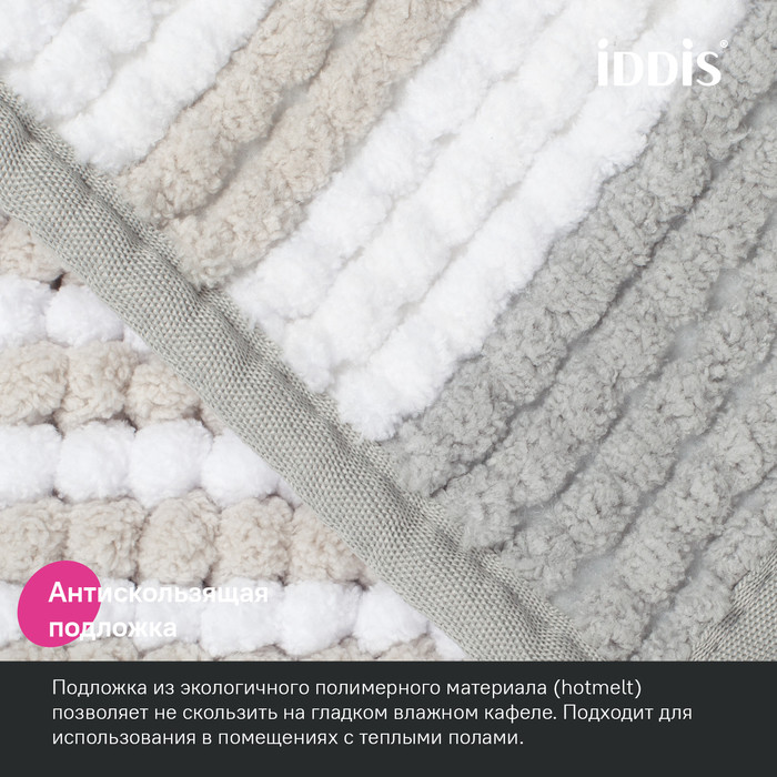 Коврик для ванной комнаты с узором в виде полос универсального светло-серого цвета в сочетании с белым и бежевым поможет сделать ее уютной и теплой. Коврик приятный и мягкий на ощупь, имеет массажный эффект. Крупный и плотный петельчатый ворс из полиэстера легко чистится и быстро сохнет. Коврик подойдет для ванной и туалета.•Этот коврик в ванную противоскользящий: специальная основа (термоклей) позволяет не скользить на гладком и влажном кафеле. Подходит для использования в помещениях с теплыми полами. •Благодаря современным влагостойким материалам и качественной обработке краев коврик не потеряет свежести красок, не обветшает и надолго останется привлекательным как в день покупки.•Несложно ухаживать: разрешена деликатная стирка при температуре до 40 градусов с жидким моющим средством; не сушить на батарее, избегать солнечных лучей.Гарантия на текстильные аксессуары IDDIS® – 1 год. (с) Авторский текст, август 2023 г