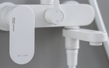 Душевой комплект легко монтируется к стене c помощью двух эксцентриков (подключение смесителя) и одного крепежного элемента (крепление стойки для душ
