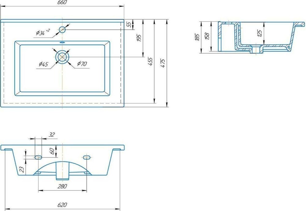 Габариты: Ш656×Г470×В185 мм. Компактная ширина позволяет разместить модель даже в небольшой ванной. Раковина предназначена для установки на тумбу. Монтаж простой – достаточно закрепить её на мебель и подключить сифон (приобретается отдельно).