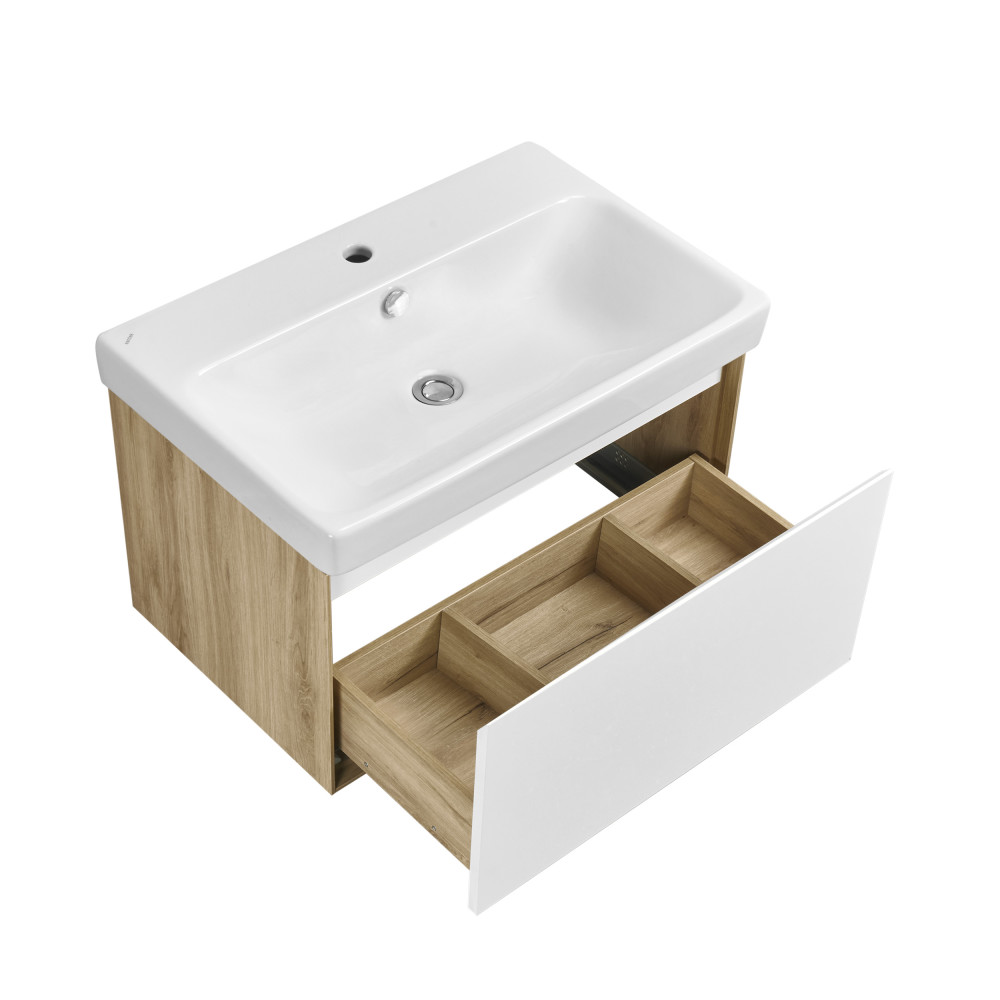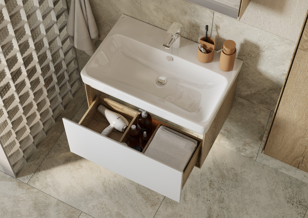 Коллекция мебели Либерти предлагает функциональные и эстетичные решения для ванных комнат. Тумбы с 1 ящиком выполнены в скандинавском стиле: сочетание теплого дерева и строгого белого глянца. Корпус и внутренняя организация тумб изготовлены из влагостойкой ЛДСП, имитирующей текстуру дерева, а фасад выполнен из влагостойкой ЛДСП в покраске белый глянец. Боковины тумб обработаны по особой технологии, создающей эффект тонких линий и в то же время сохраняющей надежность конструкции. Ящик открыввается одним нажатием, так как оснащены механизмом Push-to-Open, гарантирующим плавное открывание и закрывание. В тумбах с ящиками размером от 70 см предусмотрена регулируемая система хранения, которая позволяет организовать пространство внутри ящика максимально эффективно. Это обеспечивает комфортное хранение вещей в ванной комнате. Тумбы Либерти с 1 ящиком могут быть дополнены мебельной раковиной “Адриана”, которая отличается вместительной чашей и современным дизайном. Также они совместимы со накладными раковинами Roca Mila, и Santek Одри и Aquaton Лола, что позволяет выбрать наиболее подходящий вариант для вашего интерьера. В целом, коллекция мебели Либерти отличается простотой и элегантностью, идеально сочетая функциональность и стиль. Она станет отличным выбором для тех, кто ценит качество, комфорт и эстетику в интерьере ванной комнаты