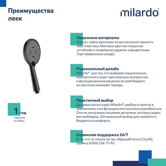 Лейка для душа Ideal Spa станет оптимальным решением для современных интерьеров. У данной модели 3 режима работы, включая редко встречающийся на рынке режим «водный туман»: поток воды рассеивается на мельчайшие частицы, даря максимальное расслабление. Режим «водного тумана» захочется выбирать снова и снова — для создания особенного настроения. •Данная модель может считаться одной из самых крупных (ø 126 мм) среди всего ассортимента леек Milardo®.●Матовое цветное покрытие защищает лейку Milardo® от появления царапин и устойчиво к выцветанию (при должном уходе).●Для очистки мягких силиконовых форсунок от загрязнений и известкового налета достаточно провести по ним пальцем.●Гарантия на душевые лейки Milardo® – 1 год. (с) Авторский текст, декабрь 2023 г