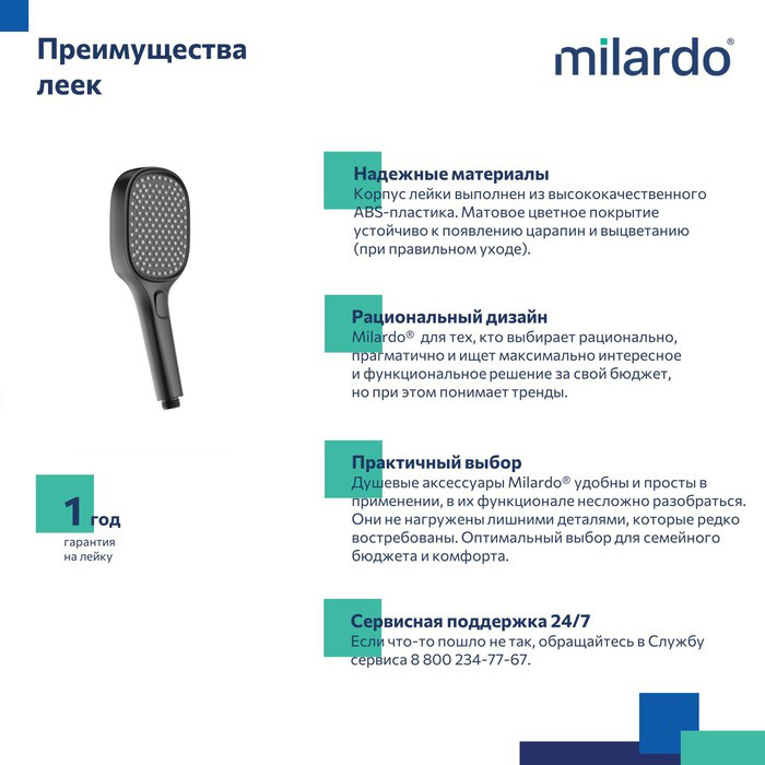 Лейка для душа Ideal Spa станет оптимальным решением для современных интерьеров. У данной модели 3 режима работы, включая редко встречающийся на рынке режим «водный туман»: поток воды рассеивается на мельчайшие частицы, даря максимальное расслабление. Режим «водного тумана» захочется выбирать снова и снова — для создания особенного настроения. Широкий водный купол делает процесс принятия душа еще более приятным благодаря большому диаметру диска лейки (122 мм).●Матовое цветное покрытие защищает лейку Milardo® от появления царапин и устойчиво к выцветанию (при должном уходе).●Форсунки выполнены из мягкого полимера, препятствующего оседанию извести внутри корпуса лейки. Для очистки форсунок от накопившегося загрязнения достаточно провести пальцем по их поверхности.●Гарантия на душевые лейки Milardo® – 1 год. (с) Авторский текст, декабрь 2023 г