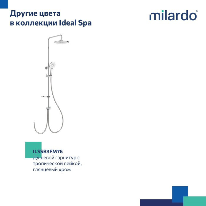 Душевой гарнитур Ideal Spa обладает простой и лаконичной формой. Тропический душ Ideal Spa – это о максимуме комфорта в повседневной рутине. Увеличенный вынос (340 мм) верхней лейки дарит большую свободу движений. Большой (250 мм) диаметр верхней лейки создает расслабляющий эффект, имитирующий пребывание под теплым летним дождем.• Дивертор плавно переключает поток воды между душевыми аксессуарами: верхняя и ручная (3 режима) лейки идут в комплекте.• Цветное покрытие устойчиво к появлению царапин и выцветанию (при правильном уходе) – такой смеситель прослужит дольше и сохранит свой первоначальный внешний вид.• Гарантия на душевые гарнитуры и душевые аксессуары Milardo® – 1 год.(с) Авторский текст, декабрь 2023 г