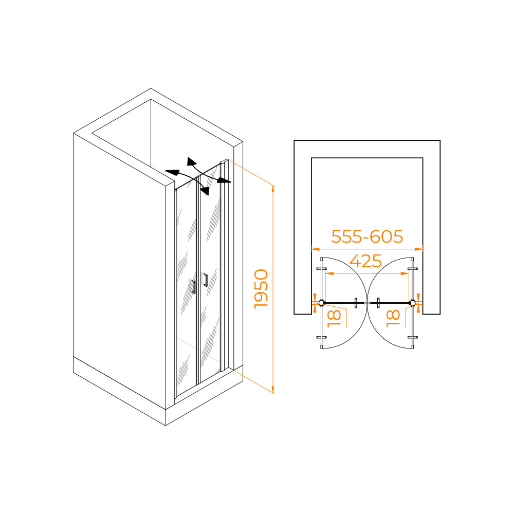 Двух створчатая маятниковая душевая дверь PA-104 с механизмом "Gravity Loop" представлена в популярных цветовых решениях: хром, черный и золото brush.