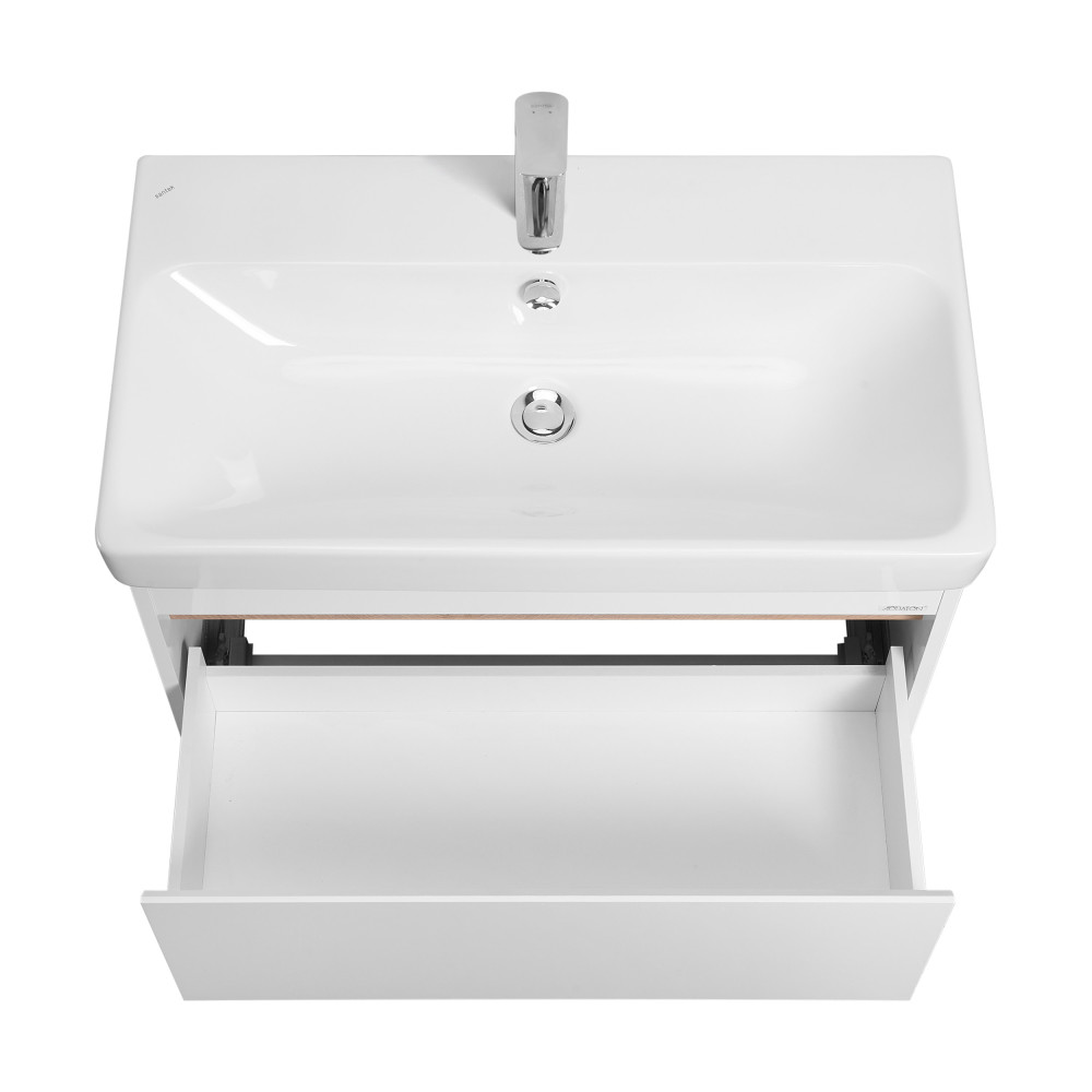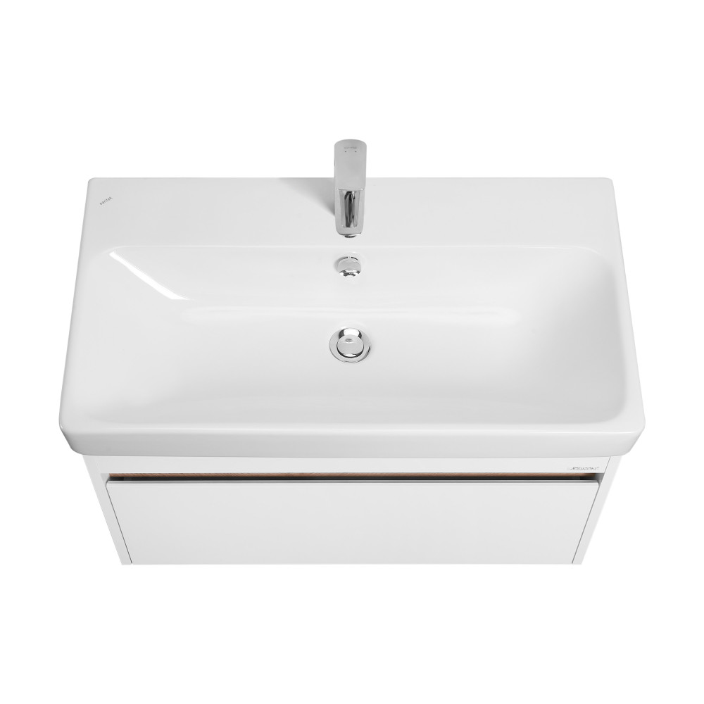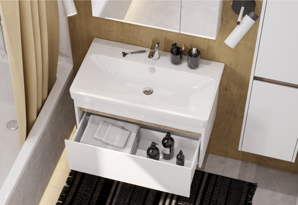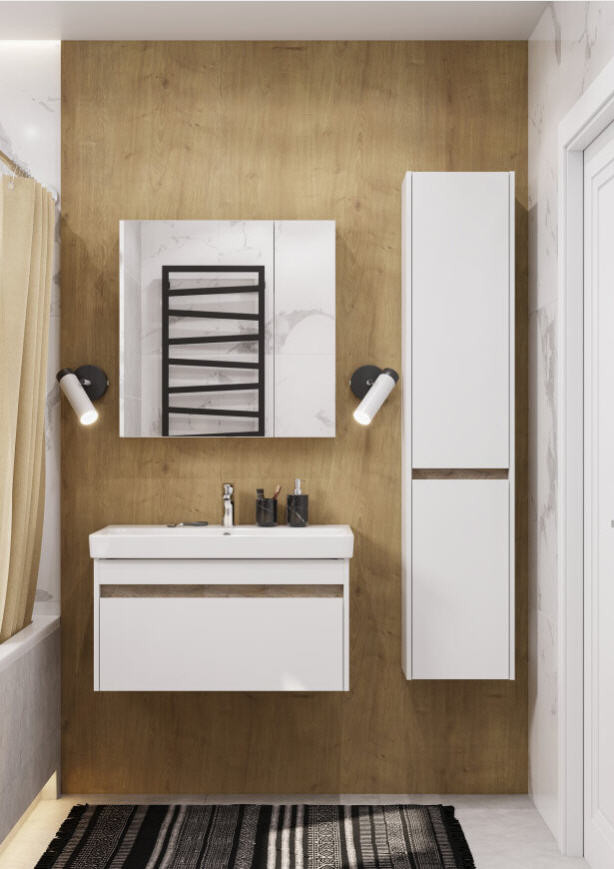 Тумба МАРТИ 80 отличается вместительностью и удобством в использовании: при желании в ящике можно организовать хранение не только шампуней и кремов, но и, например, полотенец. При этом тумба МАРТИ смотрится интересно благодаря выпилу на фасаде, который позволяет открывать тумбу за фасад: в углублении видна контрастная вставка в древесной отделке. Эта акцентная деталь придает модели графичность и позволяет подчеркнуть правильные пропорции тумбы. Корпус и боковые стенки изготовлены из влагостойкой ламинированной ДСП, окрашенной в белый цвет специальной краской ультрафиолетового отверждения для защиты мебели от влаги в условиях ванной комнаты. Декоративная вставка в цвете дуб эндгрейн
