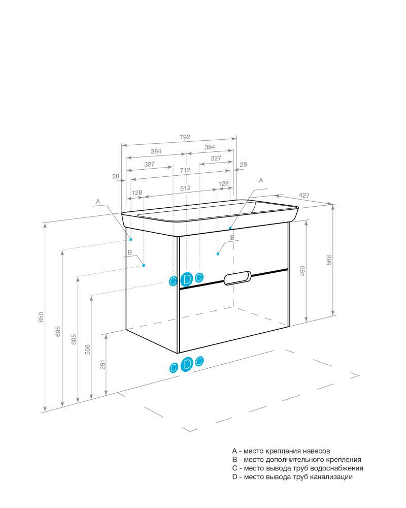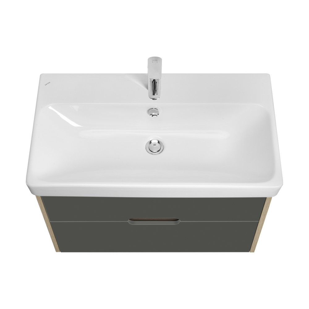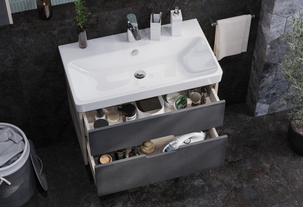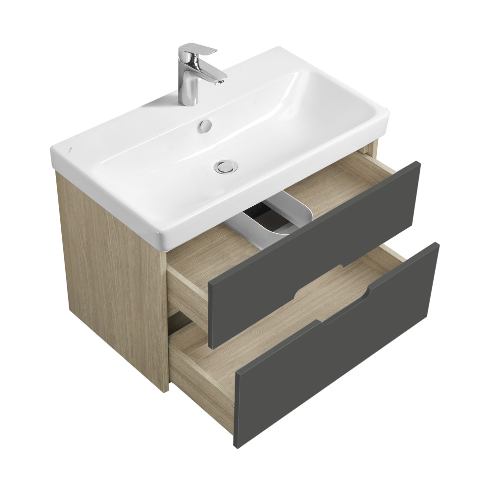 Корпус тумбы Оливия изготовлен из влагостойкой ламинированной ДСП с текстурой натурального дерева, а фасады ящиков в пленке от европейского производителя надежно защитят мебель от воздействия влаги в условиях ванной комнаты. Ящики установлены на направляющие полного выдвижения с доводчиками, что обеспечит легкий доступ ко всем предметам, которые хранятся в ящиках. Корпус и внутренние детали ящиков выполнены в единой цветовой гамме. Необычный вырез на фасадах создает имитацию ручки: оригинальный дизайн тумбы без выступающих деталей и комфортное использование. Размер ручки 18 см. К тумбе подойдет удобная современная керамическая раковина Адриана от бренда Santek