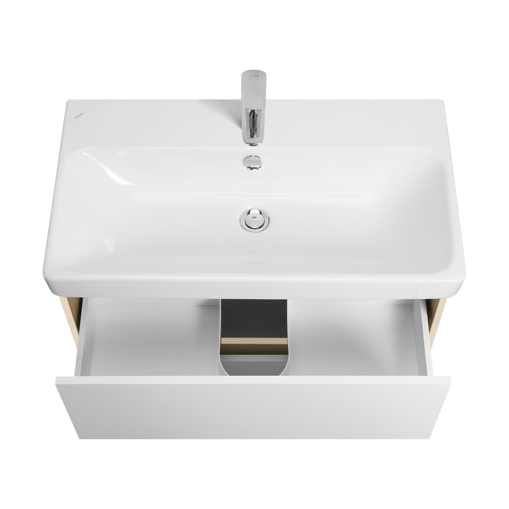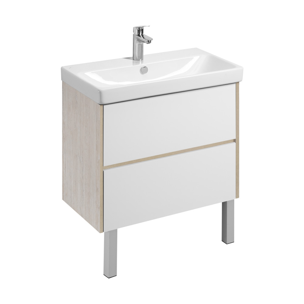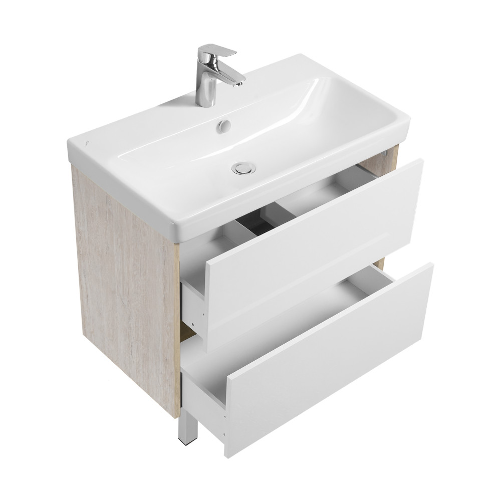 Тумба Сканди 80 выполнена в популярном минималистичном скандинавском стиле. Корпус тумбы выполнен из влагостойкой ЛДСП в декоре натурального дерева, а фасады в белой глянцевой покраске. Конструктивно тумба состоит из 2 вместительных ящиков, установленных на направляющие с интегрированной системой push-to-open для комфортного использования. На тумбе нет выступающих деталей и фурнитуры, открытие ящиков реализовано нажатием на фасад. Тумба комплектуется белоснежной раковиной Адриана от бренда Santek. Тумбу по желанию можно использовать в двух вариантах: как подвесную или дополнительно приобрести опоры