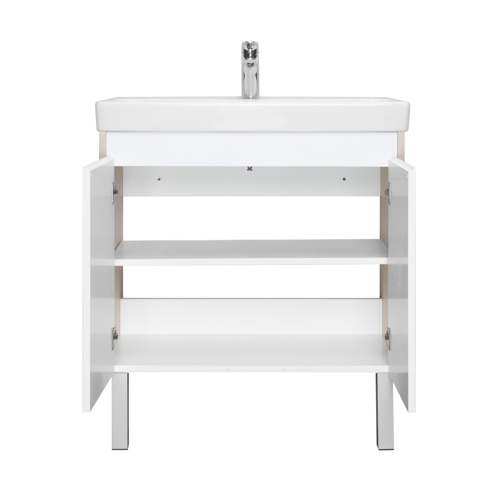 Тумба Сканди Doors 80 выполнена в популярном минималистичном скандинавском стиле. Корпус тумбы выполнен из влагостойкой ЛДСП в декоре натурального дерева, а фасады-створки в белой глянцевой покраске. За створками скрывается вместительное пространство, разделенное на две части регулируемой по высоте полкой из ВЛДСП. На тумбе нет выступающих деталей и фурнитуры, открытие створок реализуется за фасад, верхняя часть которого обработана под ручку L-профиль. К тумбе идеально подходит белоснежная раковина Адриана от бренда Santek. Раковина продается отдельно