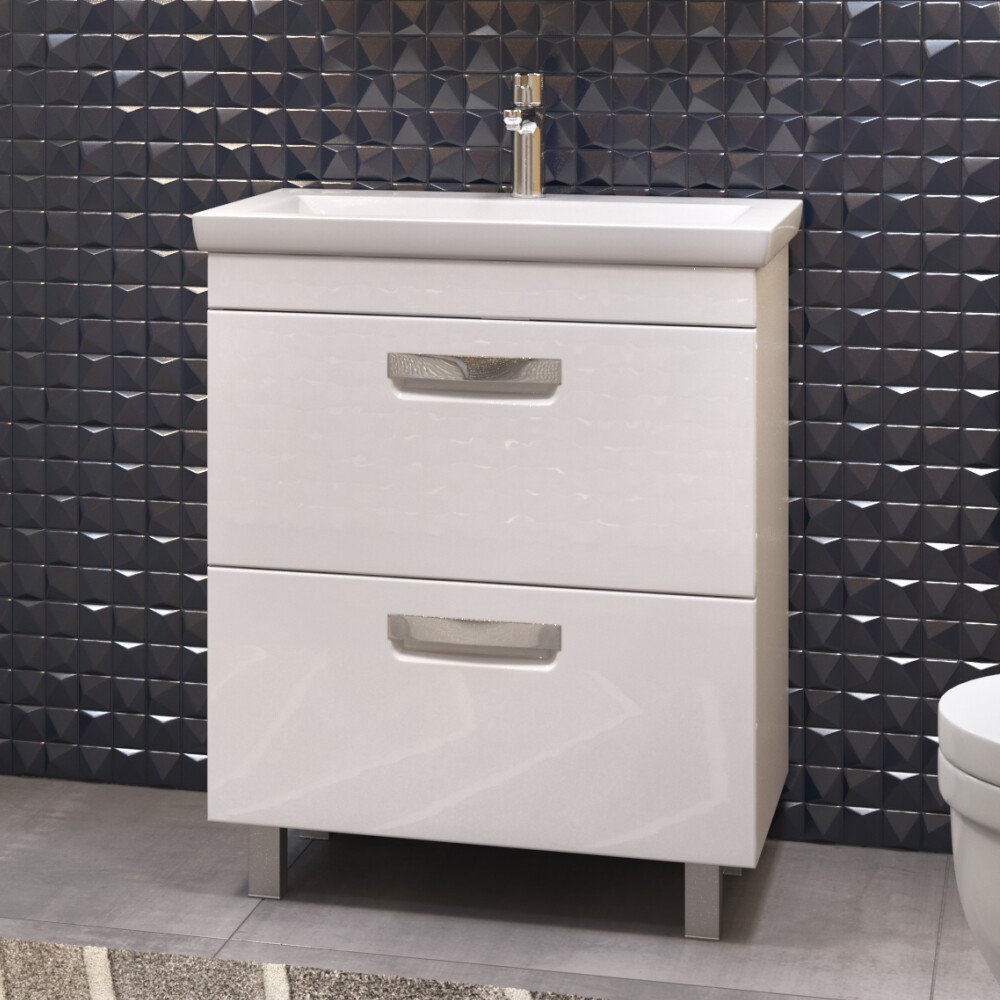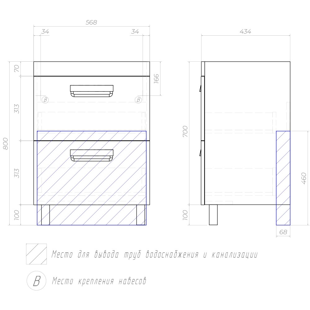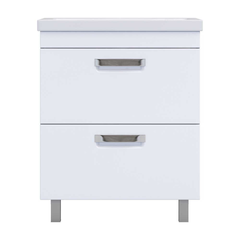 Оснащение: 2 выдвижных ящика, направляющие скрытого монтажа, 2 навеса, ручки врезныеметаллические хромированные, 2 опоры квадратные регулируемые, 1 сифон