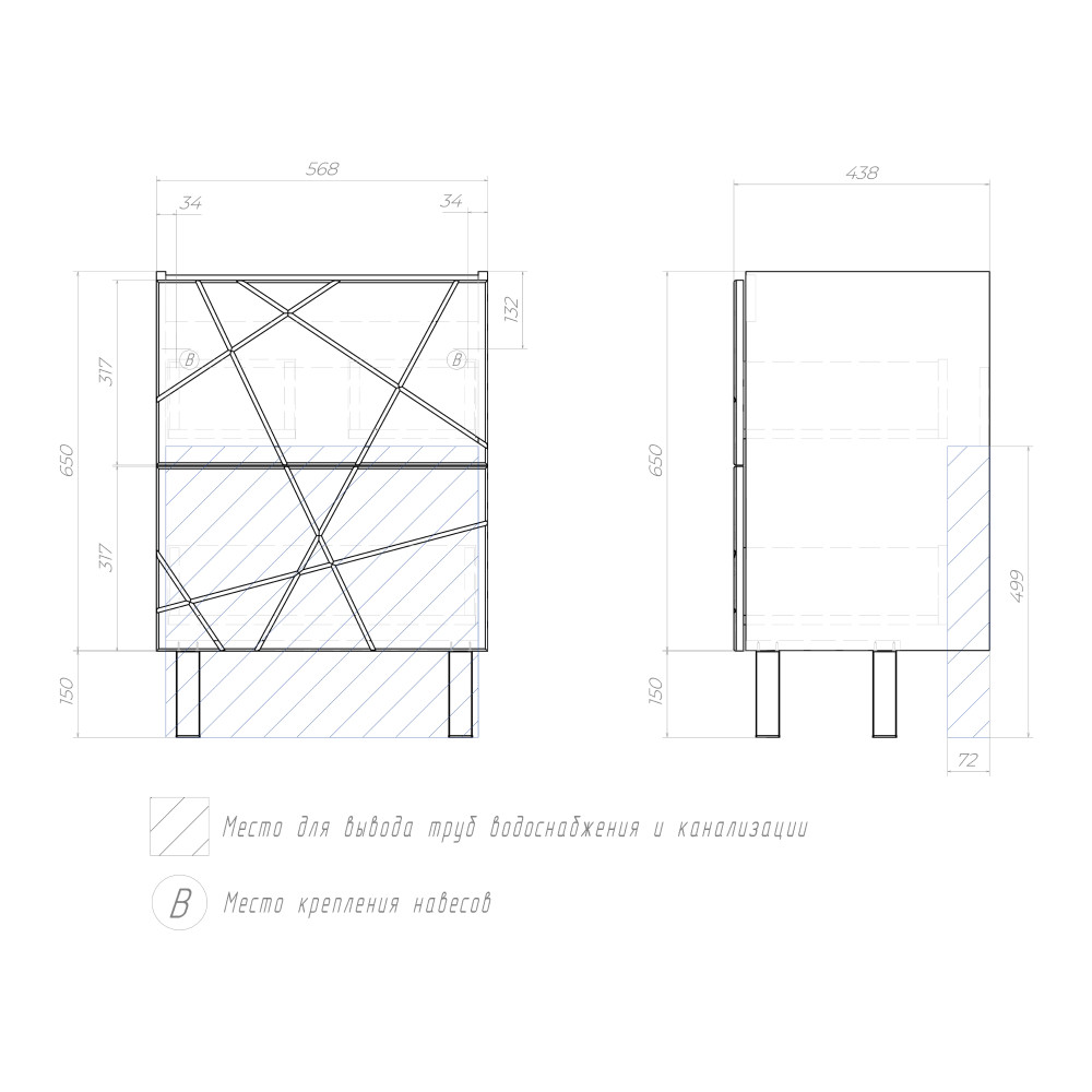 2 выдвижных ящика, скрытые направляющие, открывание нажатием "push-to-open", 2 навеса, 2 опоры квадратные регулируемые