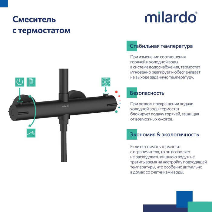 Лаконичный и стильный черный смеситель Ideal Spa будет гармонично смотреться практически в любом ин-терьере ванной комнаты. Преимущество термостата над обычным смесителем – мгновенная реакция на лю-бые изменения в соотношении горячей и холодной воды в трубопроводе. При небольших перепадах темпе-ратура смешанного потока останется стабильной, а при внезапном отключении холодной воды, термостат полностью перекроет подачу горячей. Термостат уже настроен на максимально комфортную температуру (38 °C) для экономного потребления горячей воды, что особенно актуально в домах со счетчиками воды.