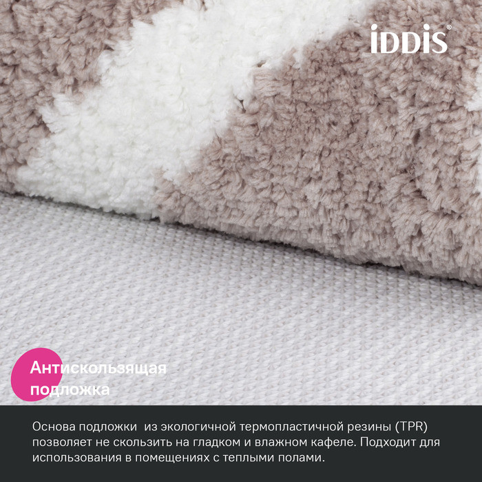 Мягкий коврик для ванной цвета мокко с белым узором имеет плотный высокий ворс (1,7 см), очень приятный на ощупь. Ворс из микрофибры отлично держит форму, легко чистится и быстро сохнет. Коврик подойдет для ванной и туалета. • Этот коврик в ванную противоскользящий: основа из экологичной термопластичной резины (TPR) позволяет не скользить на гладком и влажном кафеле. Подходит для использования в помещениях с теплыми полами. • Благодаря современным влагостойким материалам и качественной обработке краев коврик не потеряет яркости красок, не обветшает и надолго останется привлекательным как в день покупки. • Несложно ухаживать: разрешена деликатная стирка при температуре до 40 градусов с жидким моющим средством; не сушить на батарее, избегать солнечных лучей. Гарантия на текстильные аксессуары IDDIS® – 1 год. (с) Авторский текст, сентябрь 2023 г