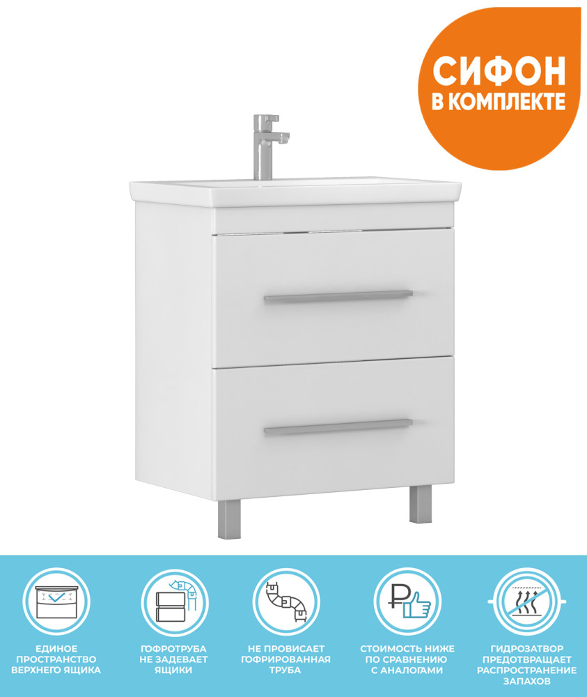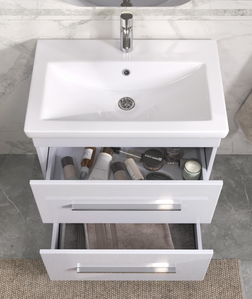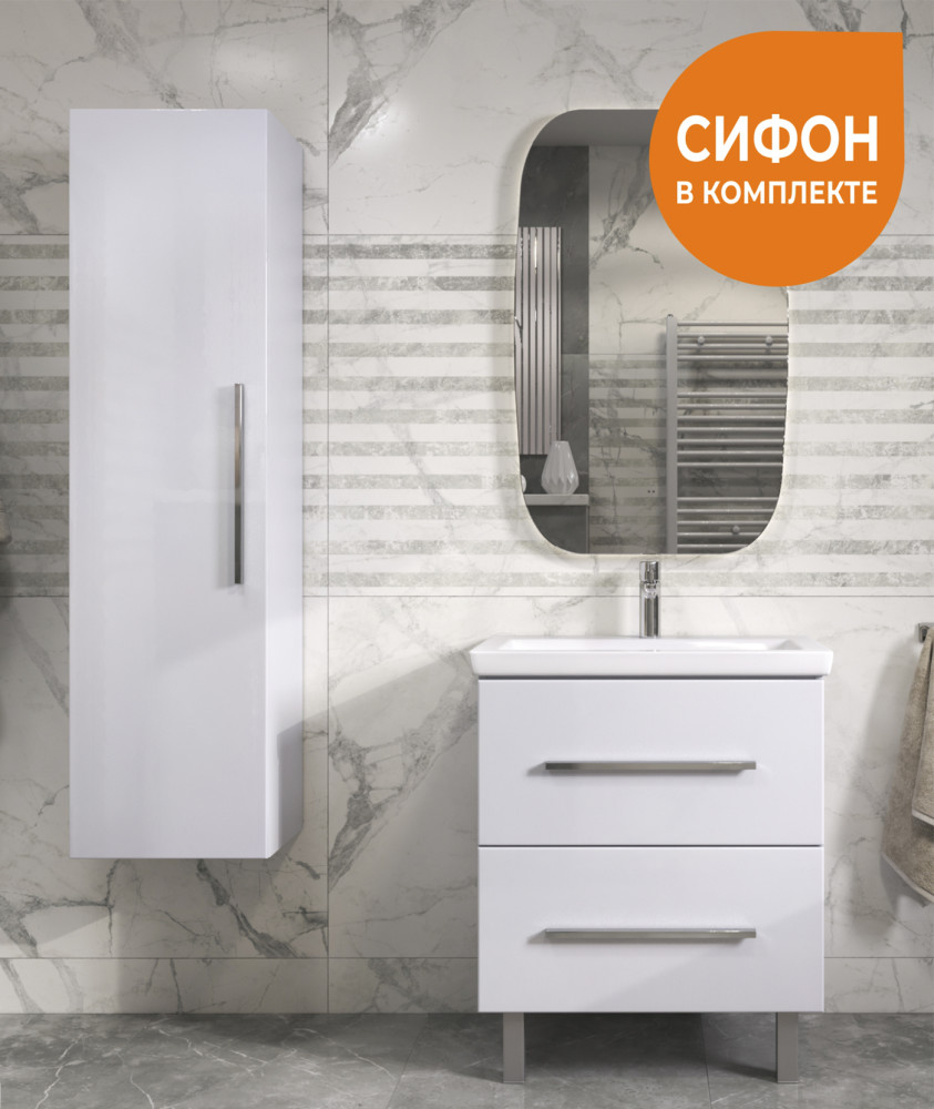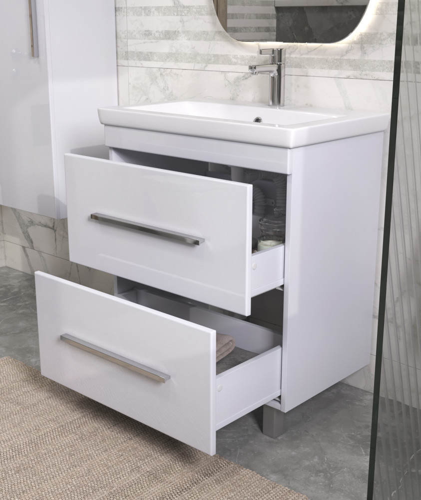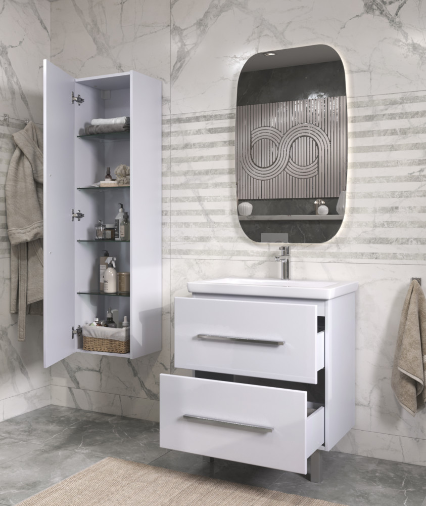 Коллекция Land — это образец современного минимализма, который станет отличным дополнением к любому интерьеру ванной комнаты. В основе дизайна коллекции — концепция простора и лёгкости.Фасады, изготовленные из ламинированного МДФ с глянцевой ПВХ-плёнкой, придают мебели изысканный вид. Хромированная лицевая фурнитура добавляет стильную нотку в лаконичный дизайн. Благодаря направляющим скрытого монтажа, ящики открываются и закрываются плавно и бесшумно