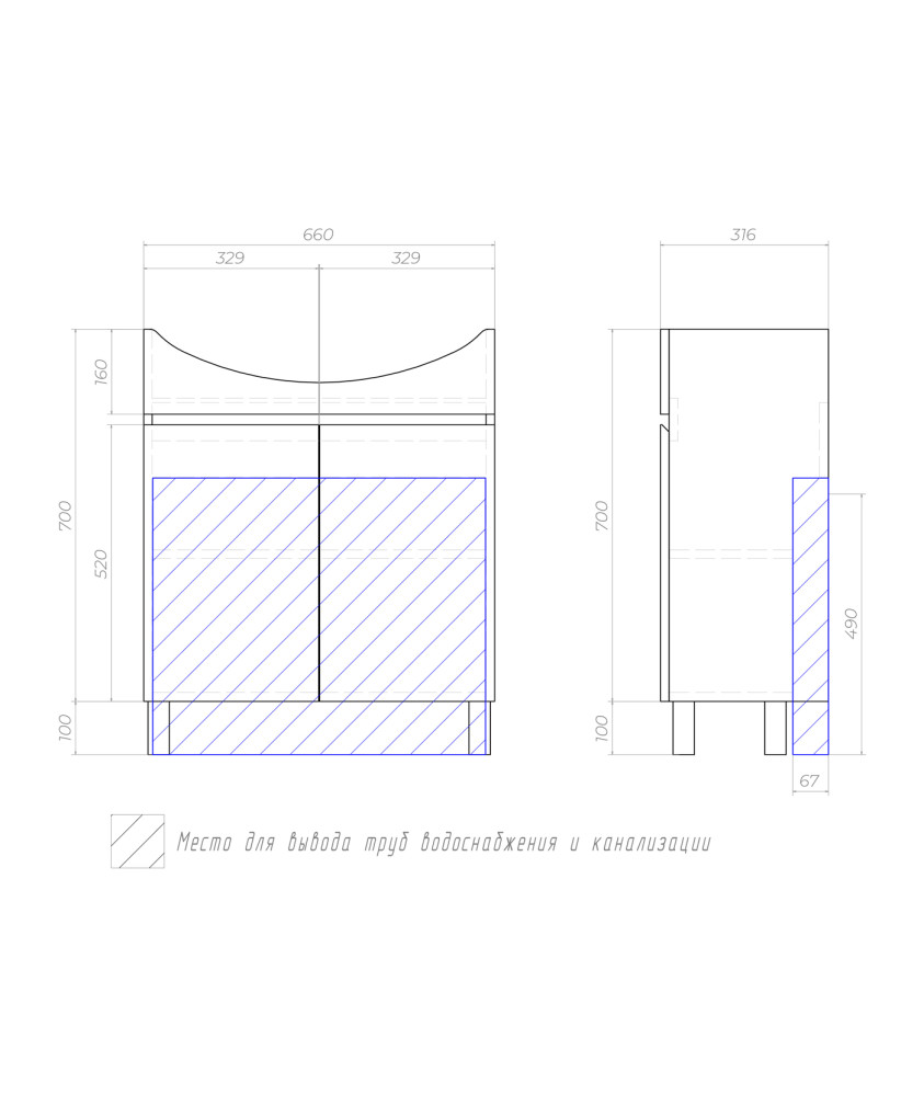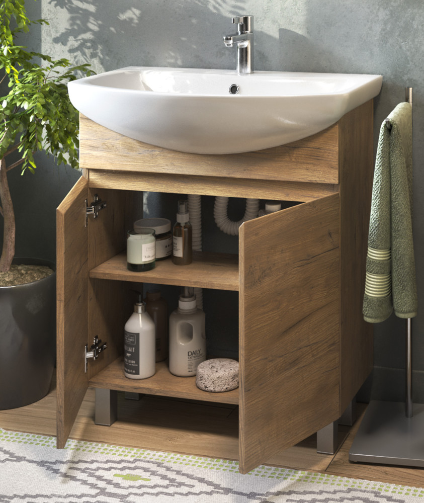 2 дверцы, петли с механизмом доводчика, 1 полка ЛДСП; 4 опоры квадратные регулируемые, 1 сифон