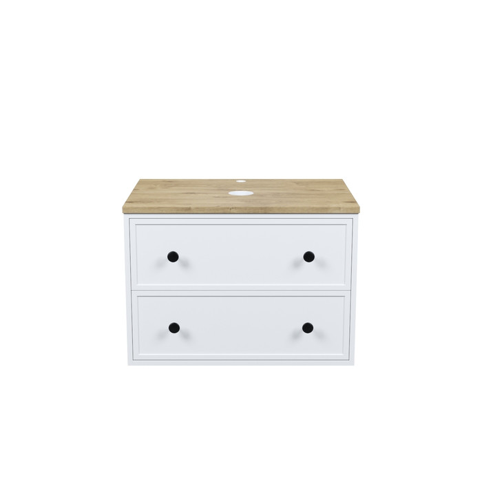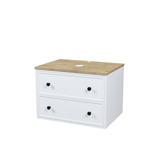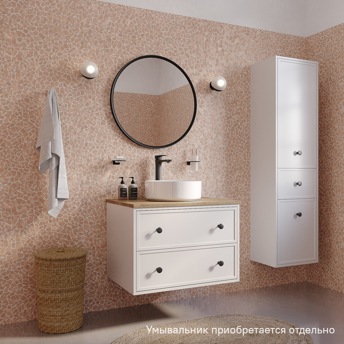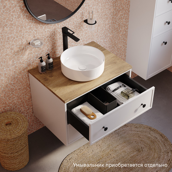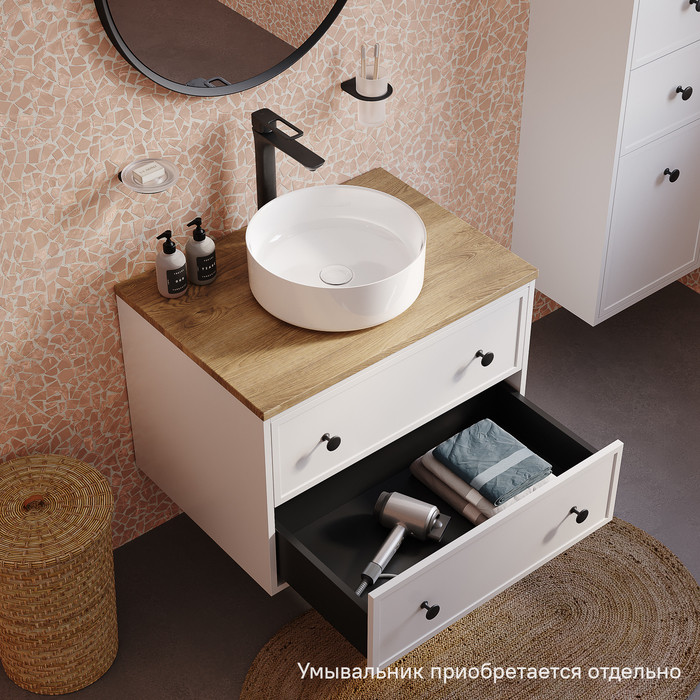 Компактная подвесная тумба Torr классического молочно-белого цвета со столешницей из МДФ в оттенке дуба верона. Сочетает в себе узнаваемый стиль и практичность популярного скандинавского дизайна. Ее четкие формы, теплый цвет дерева, фасады с декоративной филенкой, круглые ручки смотрятся гармонично и впишутся в любой современный интерьер. Подойдет любой накладной умывальник, покупается отдельно. • Два просторных выдвижных ящика закрываются плавно и бесшумно благодаря высококачественным скрытым направляющим с доводчиками Hettich. Внутри ящики графитового цвета – стильно и практично. • Многослойное покрытие матовой эмалью, предназначенной для использования в помещениях с высокой влажностью, позволит сохранить первоначальный вид мебели надолго (при должном уходе). • Надежная фурнитура Hettich рассчитана на 30 000 открываний – это более 10 лет исправной работы. Гарантия на мебель IDDIS® – 3 года