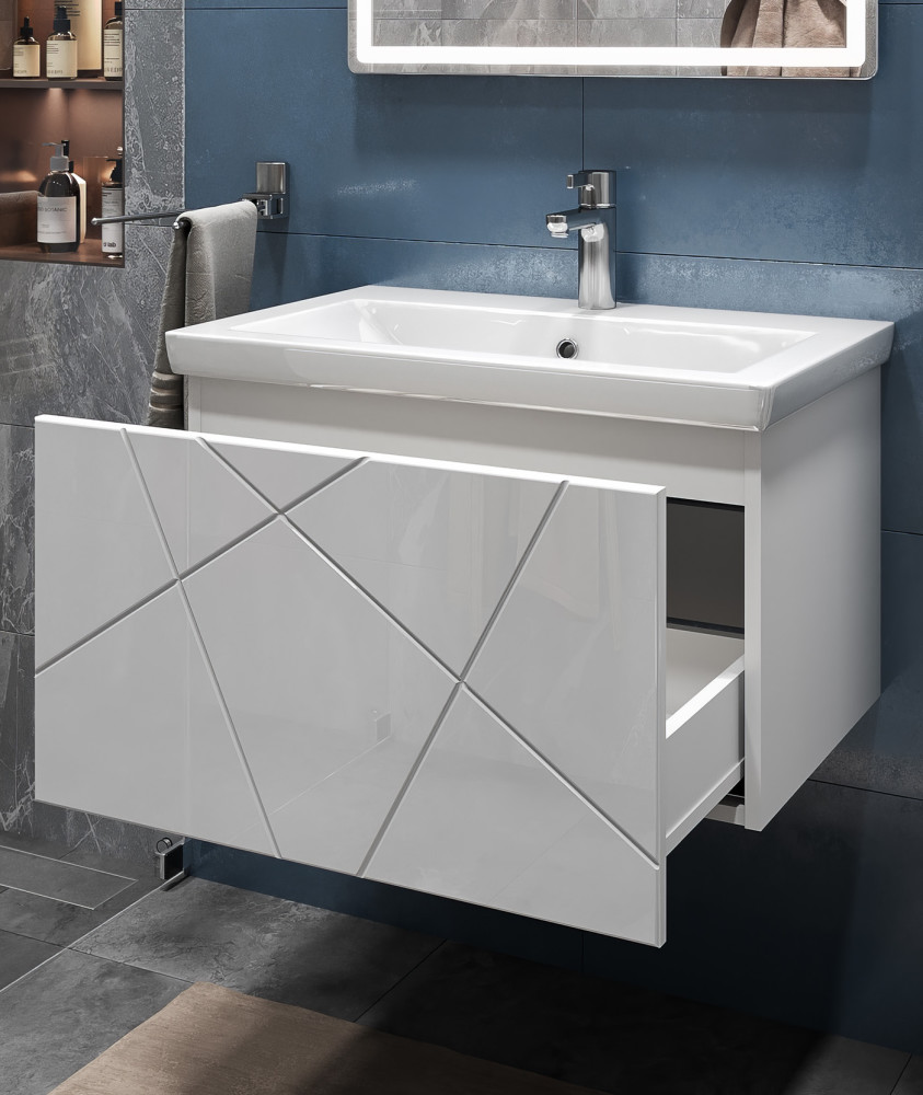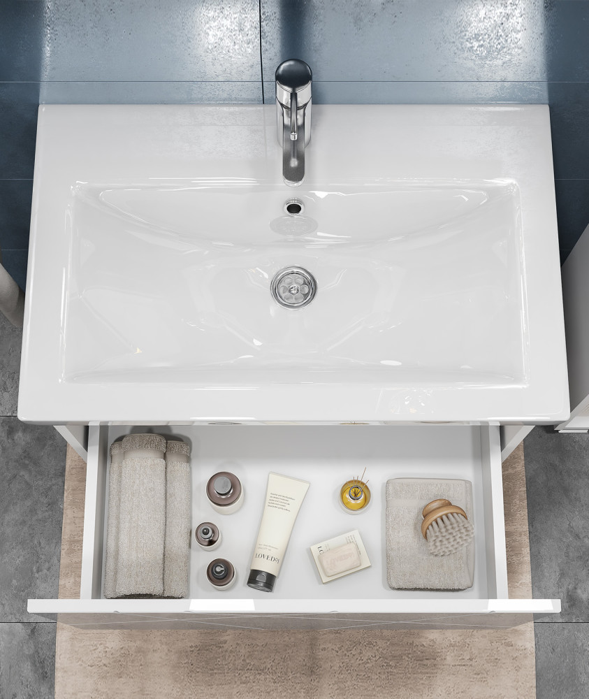 1 выдвижной ящик, скрытые направляющие, открывание нажатием "push-to-open", 2 навеса, 1 сифон