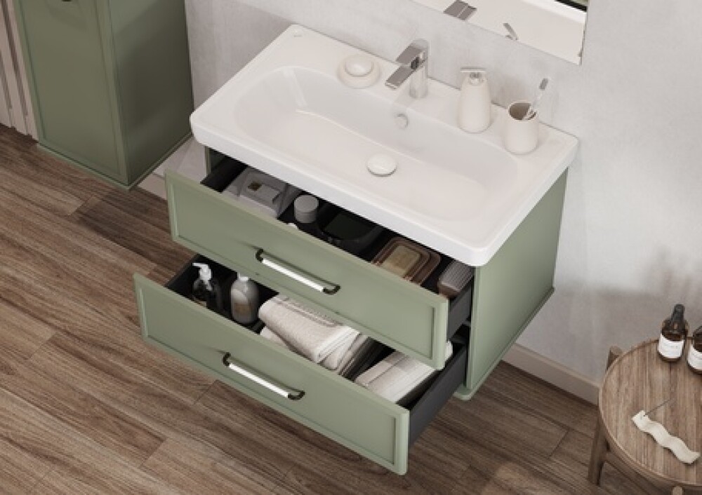 Коллекция мебели Нео-классика представляет собой гармоничное сочетание традиционных элементов и современных тенденций, создавая неповторимый стиль вашей ванной комнаты.Тумба изготовлена из высококачественной МДФ, покрытой матовой плёнкой. Фасады с фрезеровкой в рамочной форме гармонично сочетаются с остальными предметами этой коллекции. В тумбе есть два вместительных ящика с эргономичной организацией пространства, которую можно настроить по своему удобству. Ящики открываются при помощи удобной ручки, а благодаря направляющим с доводчиками обеспечивается плавное закрытие, что гарантирует бесшумность и комфорт использования мебели