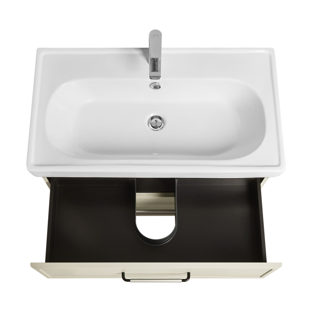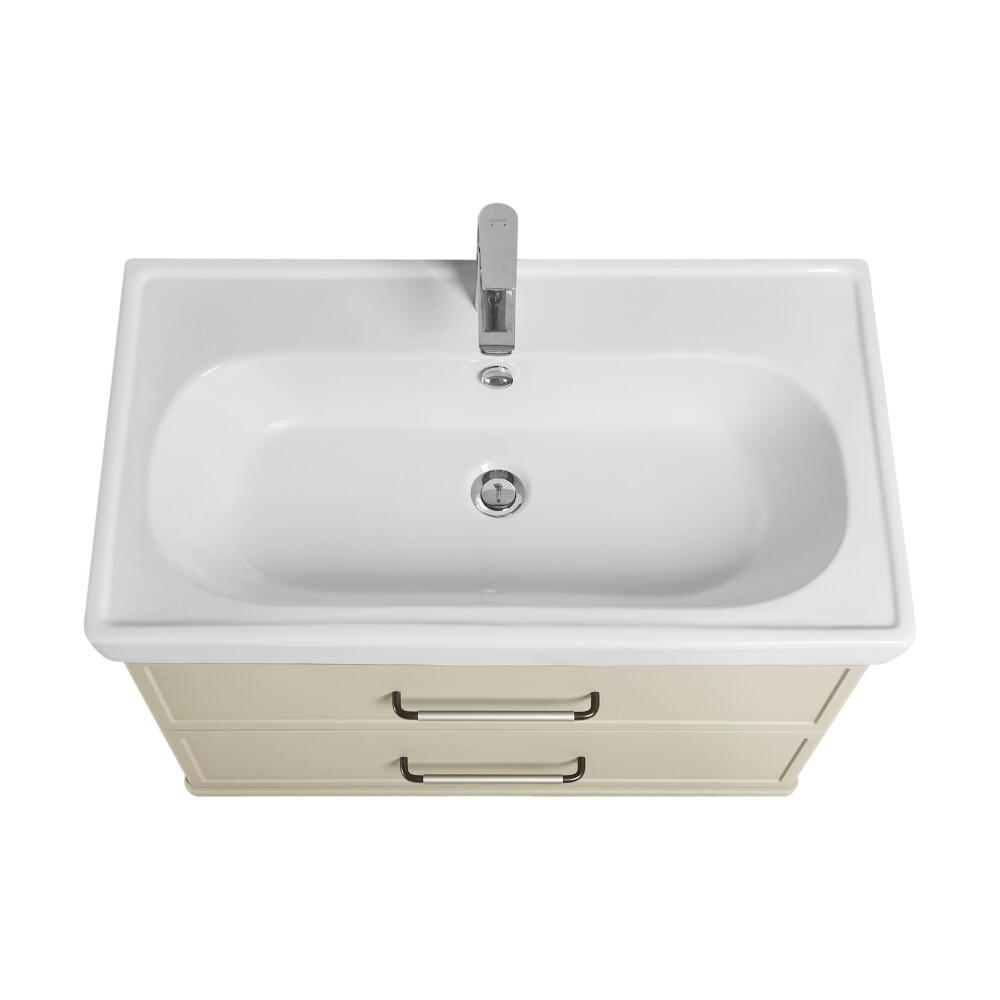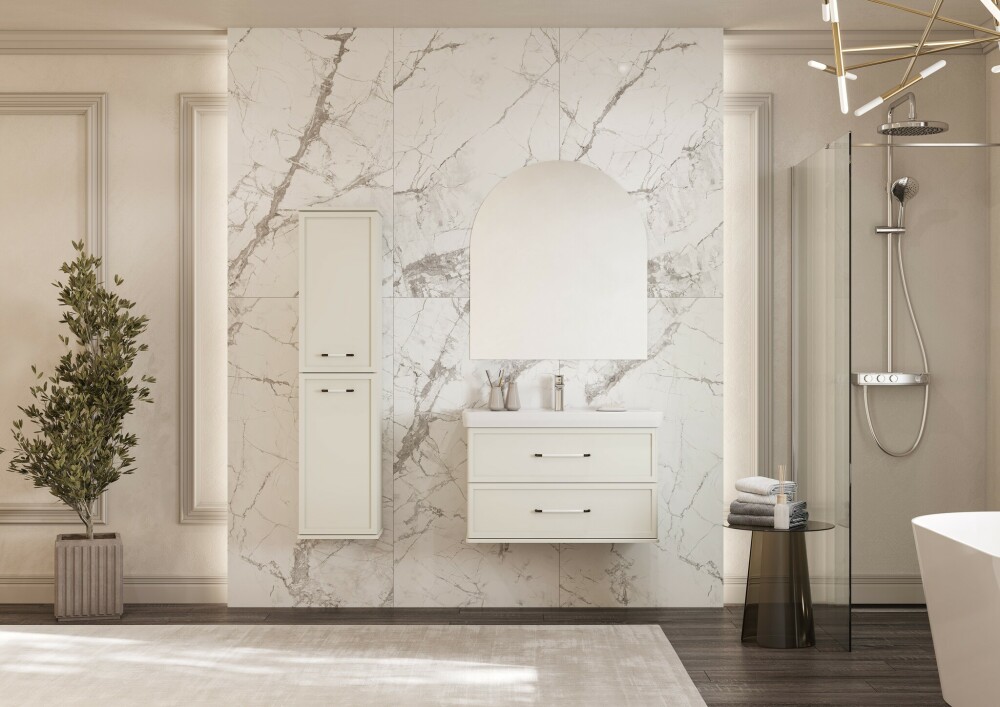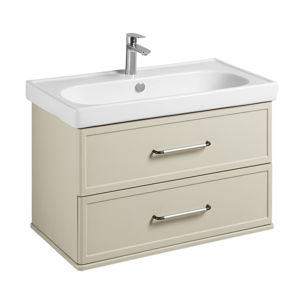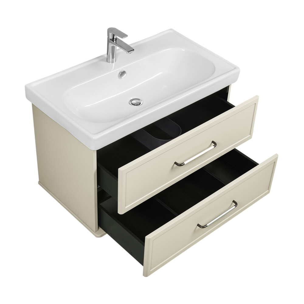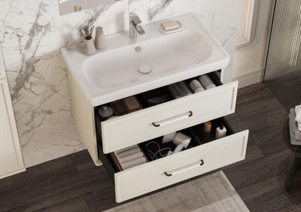Коллекция мебели Нео-классика представляет собой гармоничное сочетание традиционных элементов и современных тенденций, создавая неповторимый стиль вашей ванной комнаты.Тумба изготовлена из высококачественной МДФ, покрытой матовой плёнкой. Фасады с фрезеровкой в рамочной форме гармонично сочетаются с остальными предметами этой коллекции. В тумбе есть два вместительных ящика с эргономичной организацией пространства, которую можно настроить по своему удобству. Ящики открываются при помощи удобной ручки, а благодаря направляющим с доводчиками обеспечивается плавное закрытие, что гарантирует бесшумность и комфорт использования мебели