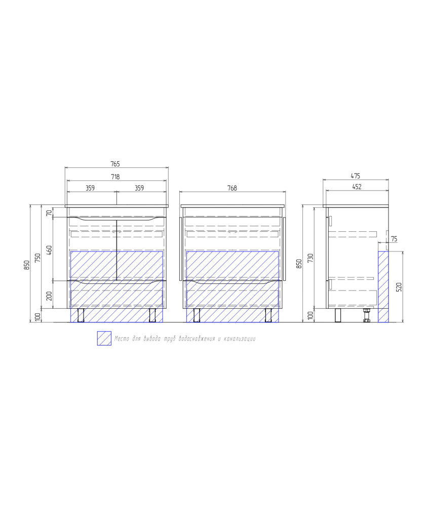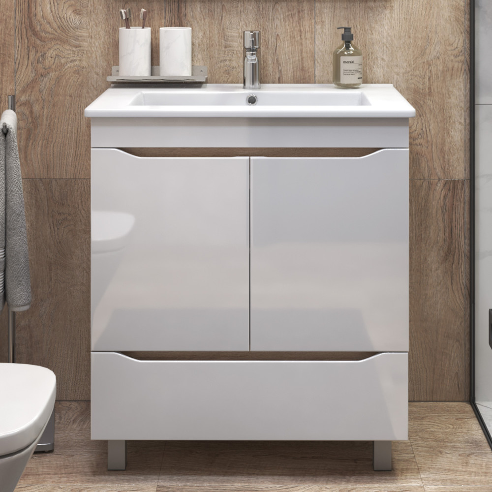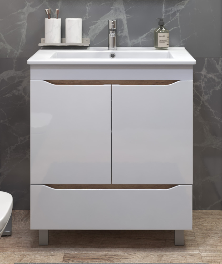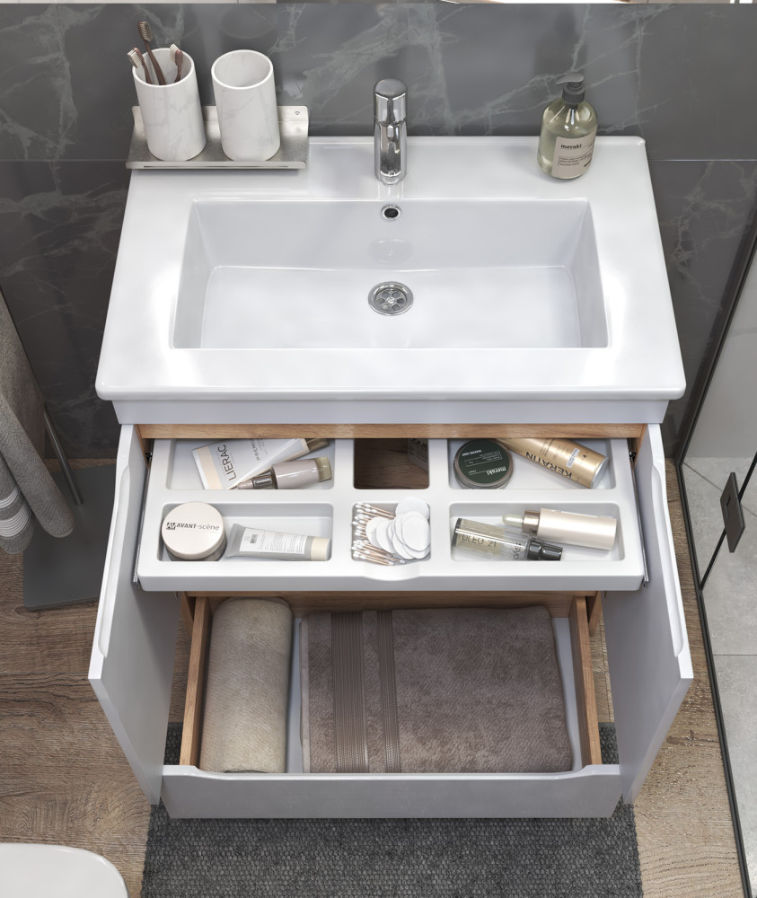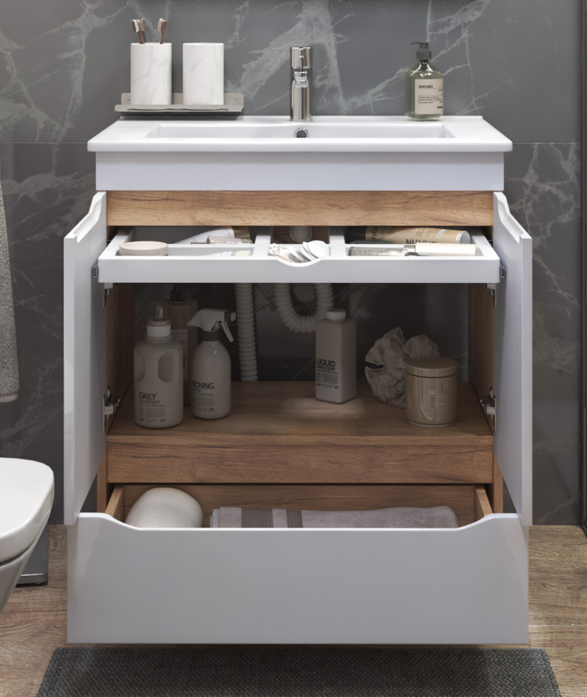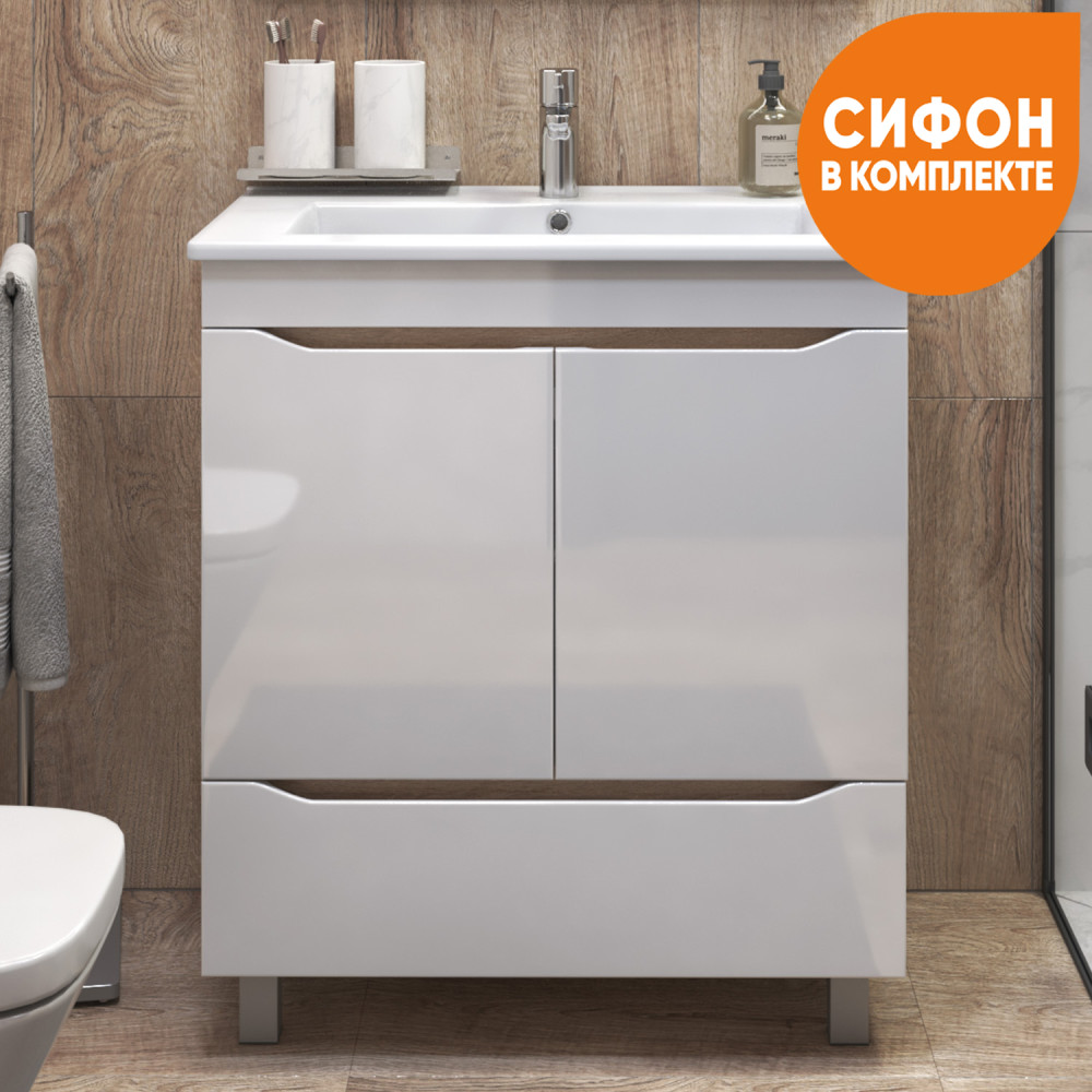 2 дверцы, петли с механизмом доводчика, 1 ящик, выдвижной органайзер для мелочей, направляющие шариковые полного выдвижения, 2 опоры квадратные регулируемые; 2 кухонные опоры, 1 сифон