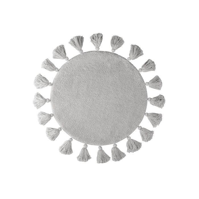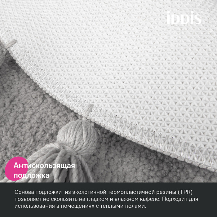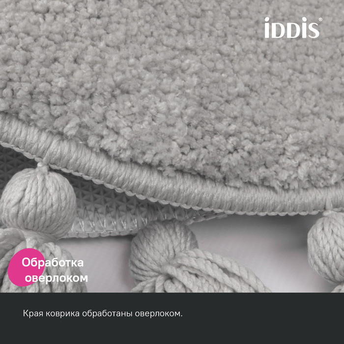 Мягкий однотонный серый коврик для ванной диаметром 55 см с декоративными пушистыми кисточками, очень приятный на ощупь. Ворс из микрофибры отлично держит форму, легко чистится и быстро сохнет. Коврик подойдет для ванной и туалета, а также поможет создать уют в спальне или гостиной. • Коврик противоскользящий: основа из экологичной термопластичной резины (TPR) позволяет не скользить на гладком и влажном кафеле. Подходит для использования в помещениях с теплыми полами. • Благодаря современным влагостойким материалам и качественной обработке краев коврик не потеряет яркости красок, не обветшает и надолго останется привлекательным как в день покупки. • Рекомендуется стирка при температуре до 40 градусов с жидким моющим средством; не сушить на батарее, избегать солнечных лучей. Гарантия на текстильные аксессуары IDDIS® – 1 год