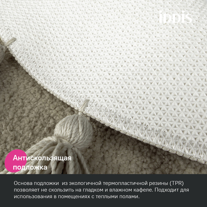 Мягкий круглый бежевый коврик для ванной диаметром 55 см с декоративными пушистыми кисточками, очень приятный на ощупь. Ворс из микрофибры отлично держит форму, легко чистится и быстро сохнет. Коврик подойдет для ванной и туалета, а также поможет создать уют в спальне или гостиной. • Коврик противоскользящий: основа из экологичной термопластичной резины (TPR) позволяет не скользить на гладком и влажном кафеле. Подходит для использования в помещениях с теплыми полами. • Благодаря современным влагостойким материалам и качественной обработке краев коврик не потеряет яркости красок, не обветшает и надолго останется привлекательным как в день покупки. • Рекомендуется ручная стирка при температуре до 40 градусов с жидким моющим средством; не сушить на батарее, избегать солнечных лучей. Гарантия на текстильные аксессуары IDDIS® – 1 год