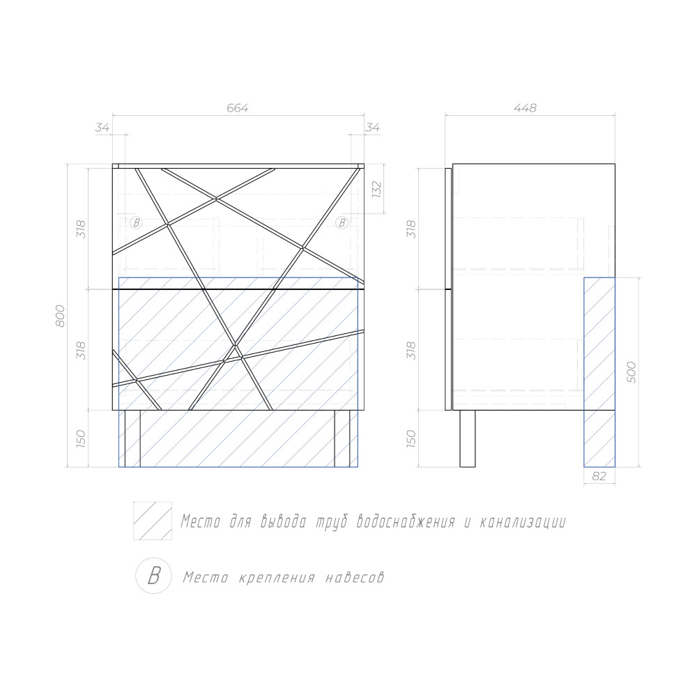2 выдвижных ящика, скрытые направляющие, открывание нажатием "push-to-open", 2 навеса, 2 опоры квадратные регулируемые