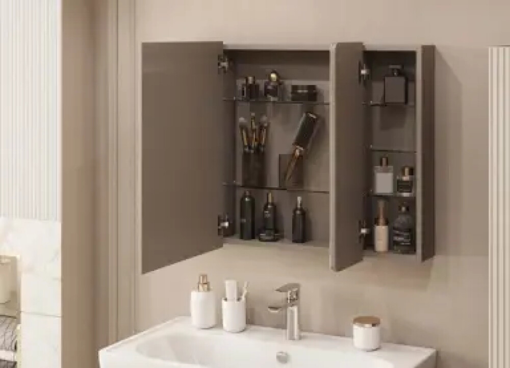 Коллекция мебели Ар-Деко воплощает изящество и элегантность этого уникального направления. Каждая деталь коллекции от массивных хромированных ручек до фрезерованных панелей - продумана до мелочей. Зеркальный шкаф выполнен из влагостойкой ЛДСП: корпус выполнен из ЛВДСП в цвете кашемир, а фасад из ЛВДСП, покрытый зеркальным полотном. Фасад зеркального шкафа имеет закругленные углы, что повторяет стилистику Ар-деко и мягкие плавные закругления на раковине. Внутреннее пространство разделено на три половины, в каждой из которой есть регулируемые полочки из затемненного стекла для хранения. Эти полочки также установлены на специальных держателях, что предотвращает опрокидывание предметов. Открывание за фасад позволяет быстро добраться до необходимых вещей, а благодаря петлям с доводчиками обеспечивается плавное закрывание, что гарантирует бесшумность и комфорт использования мебели