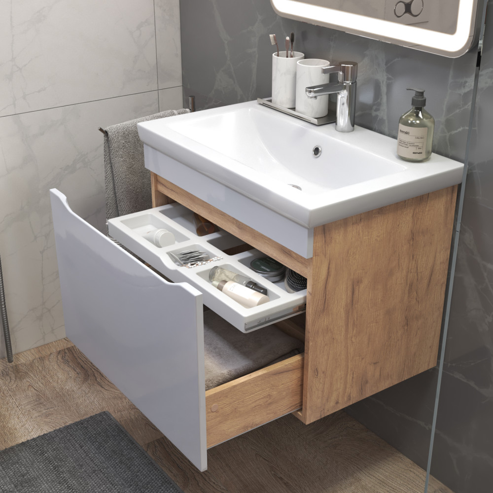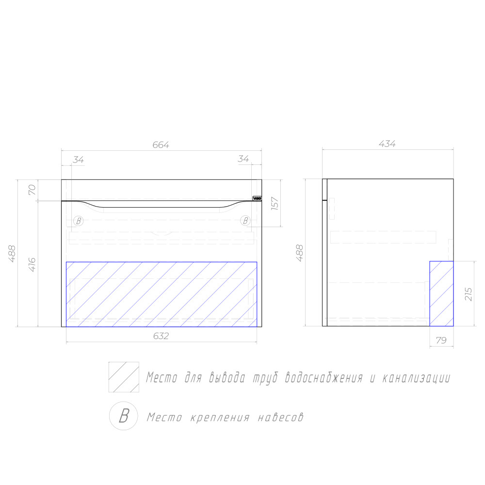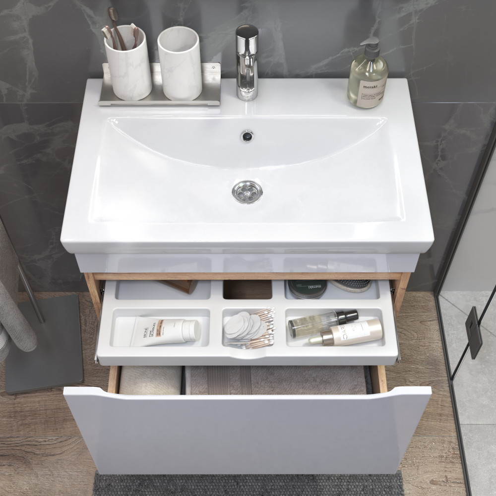 1 ящик, выдвижной органайзер для мелочей, направляющие шариковые полного выдвижения, 2 навеса, 1 сифон