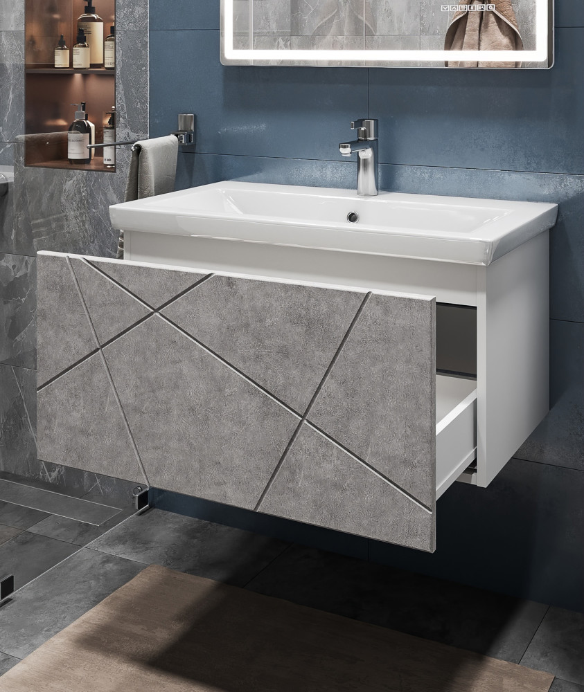1 выдвижной ящик, скрытые направляющие, открывание нажатием "push-to-open", 2 навеса, 1 сифон