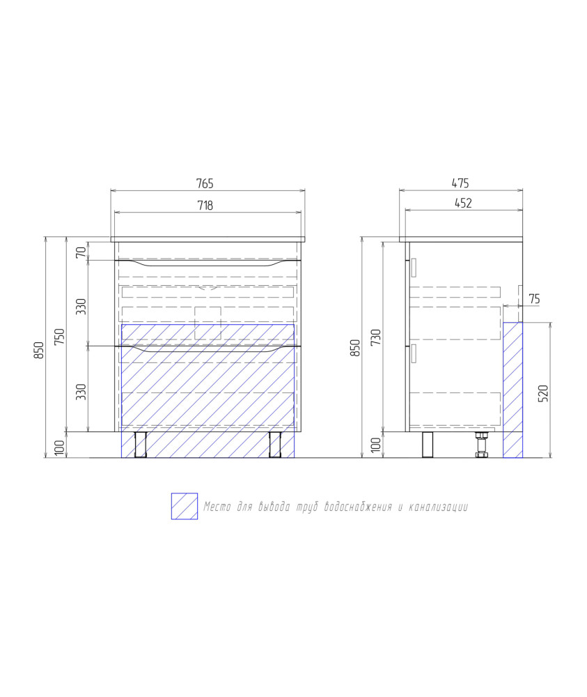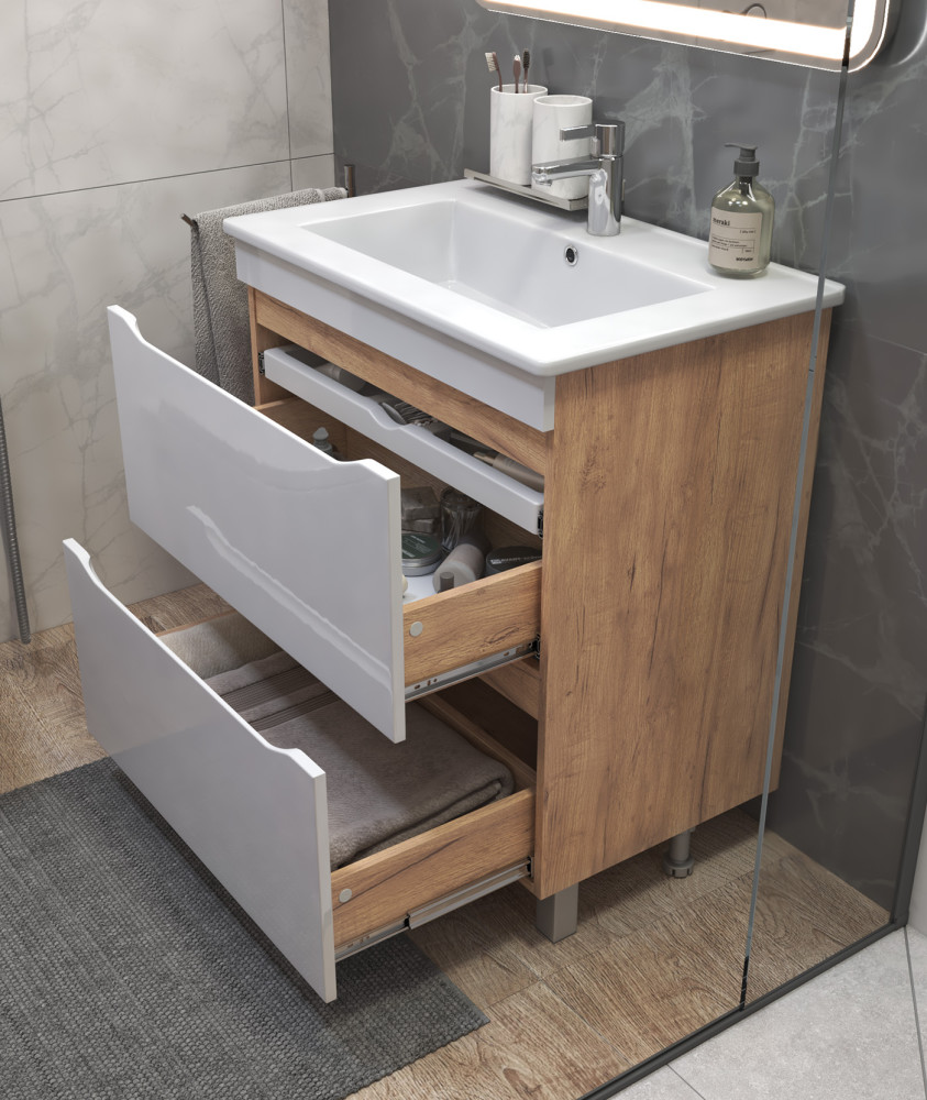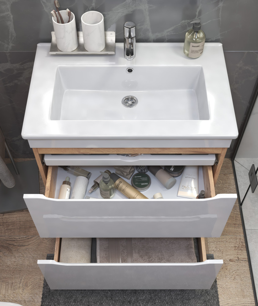 2 ящика, выдвижной органайзер для мелочей, направляющие шариковые полного выдвижения, 2 опоры квадратные регулируемые; 2 кухонные опоры, 1 сифон