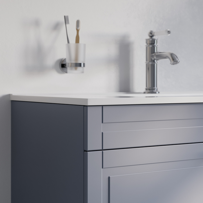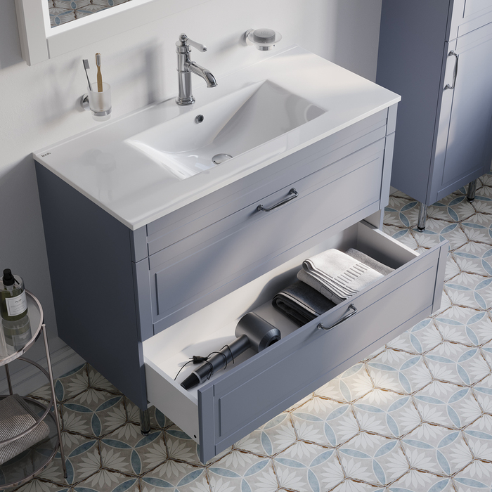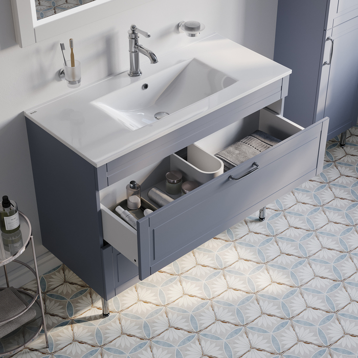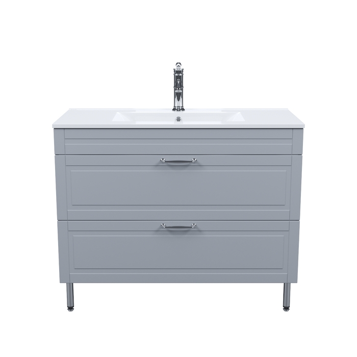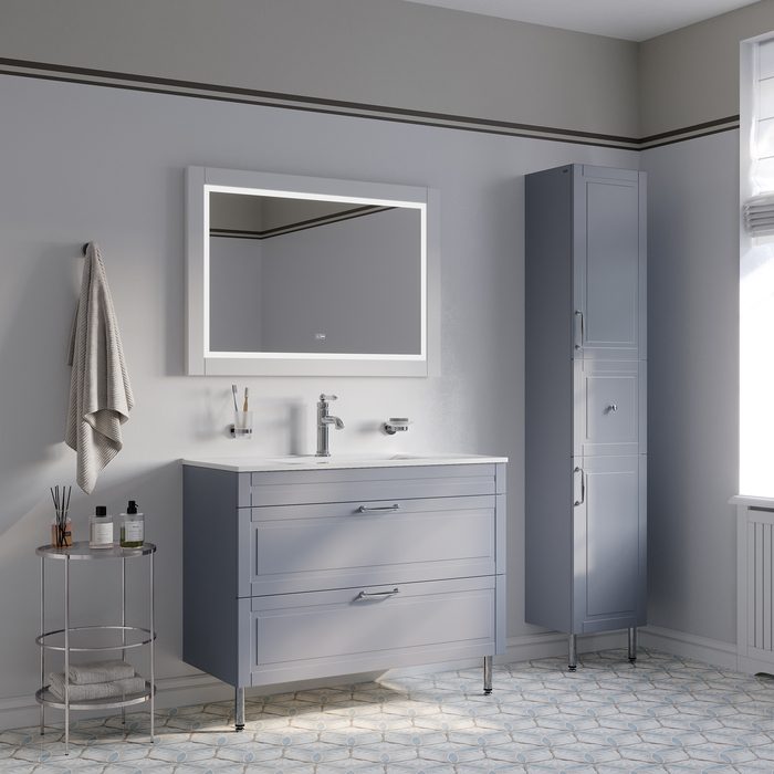 Вместительная напольная тумба Oxford изысканного светло-серого цвета – модное сочетание классического стиля и стиля ретро. Она органично впишется в интерьер благодаря элегантному фрезерованному фасаду и узнаваемому дизайну. В комплекте плоский эргономичный умывальник. • Два выдвижных ящика закрываются плавно и бесшумно благодаря скрытым направляющим с доводчиками немецкого производства. Ограничитель под сифон в верхнем ящике позволяет эффективнее использовать его пространство. • Хромированные ножки и ручки дополняют цвет фасада и сочетаются с дизайном одноименных смесителей IDDIS® и смесителей в стиле ретро. Несложно подобрать все необходимое для создания гармоничного интерьера. • Поверхность фасадов бархатистая, приятная на ощупь. Это ощущение создает полуматовая полимерная эмаль с эффектом soft touch. • Фурнитура рассчитана на 30 000 открываний – это более 10 лет исправной работы. Гарантия на мебель IDDIS® – 3 года