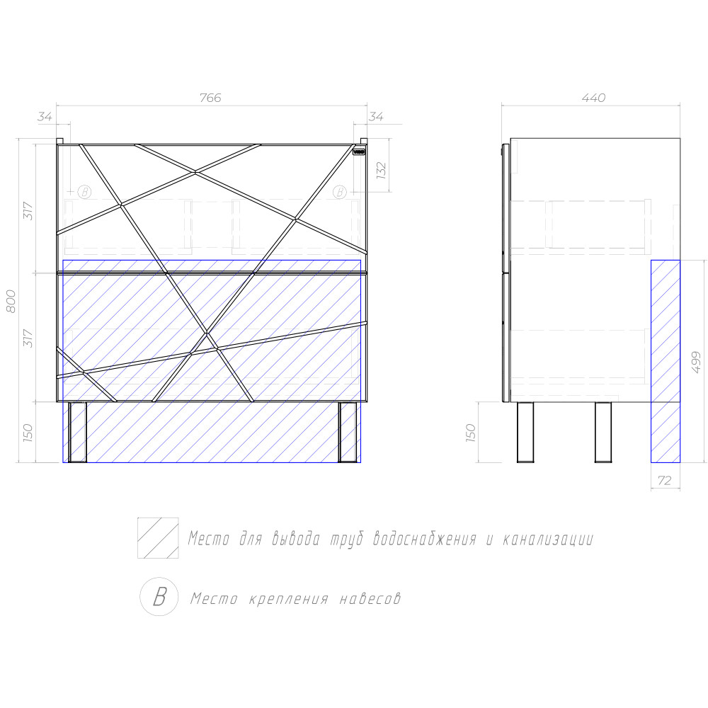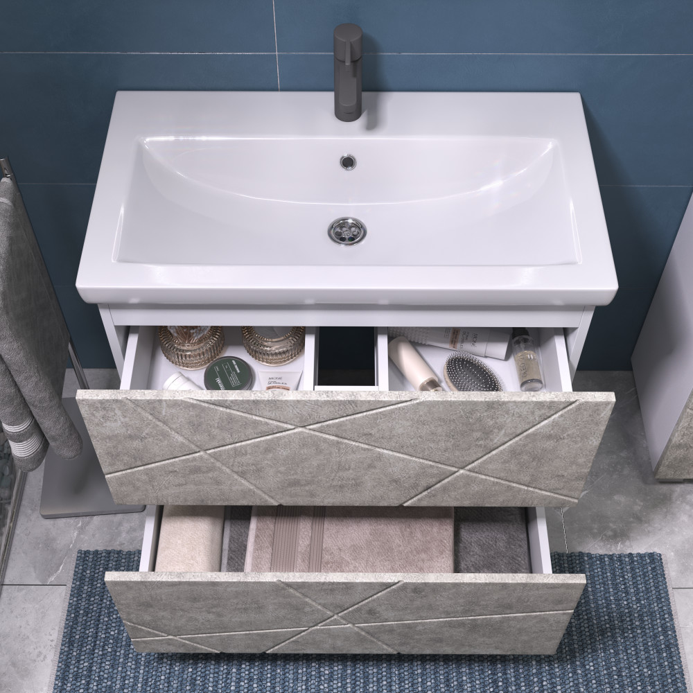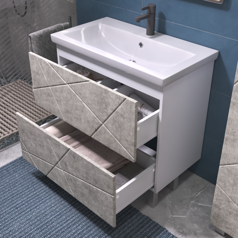2 выдвижных ящика, скрытые направляющие, открывание нажатием "push-to-open", 2 навеса, 2 опоры квадратные регулируемые