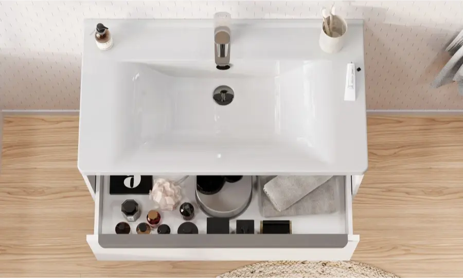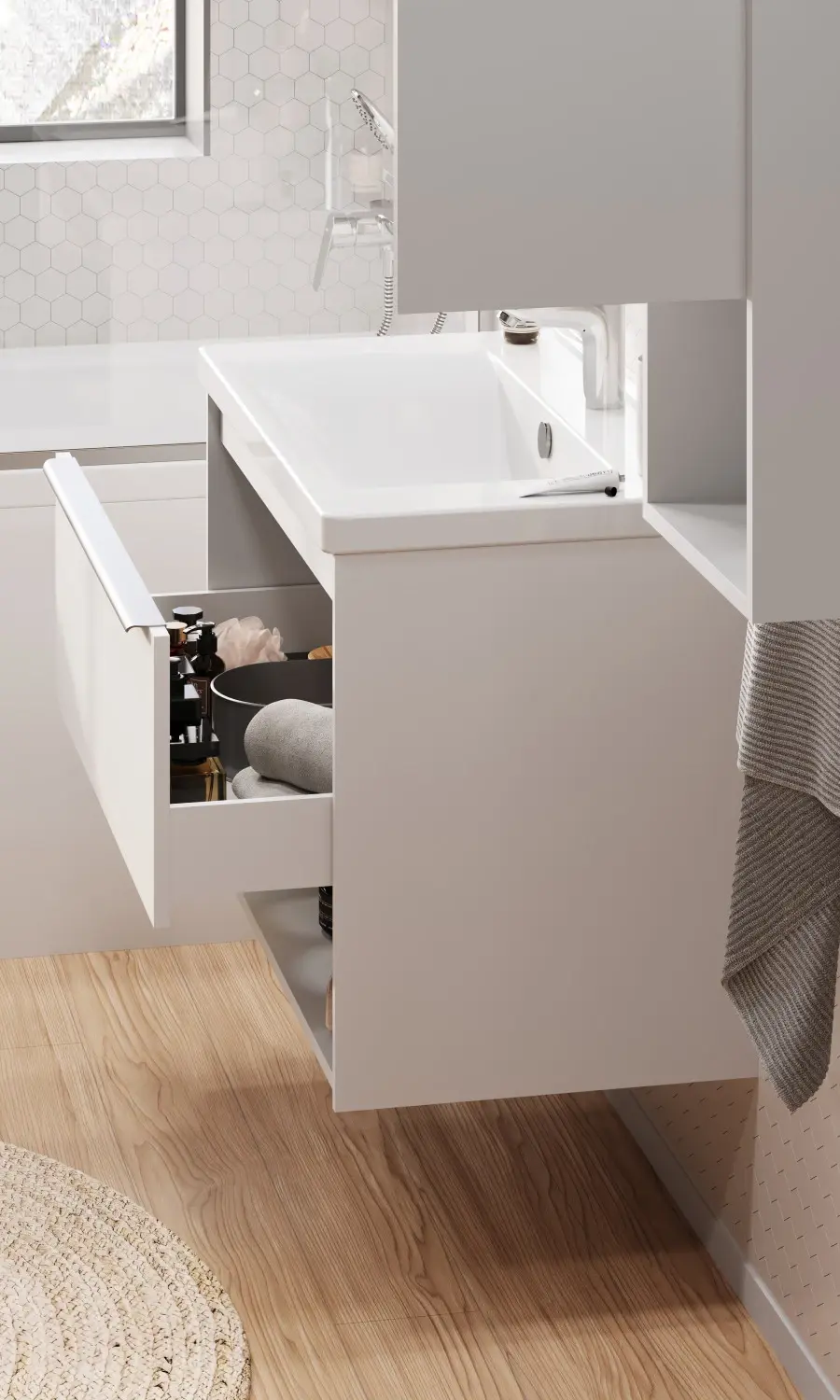Тумбы коллекции Хоуп за счет своих цветовых решений в белом, древесном и светло-зеленом исполнении идеально впишутся в любой стиль ванной комнаты, от минимализма до классики, создавая атмосферу уюта и комфорта. Они не только помогут поддерживать порядок, но и станут ярким акцентом вашего интерьера. Направляющие полного выдвижения скрытого монтажа с доводчиком позволят использовать весь функционал ящиков бесшумно и с комфортом, а открытая ниша дает возможность убирать туда необходимы принадлежности, чтобы они всегда были под рукой. Высота полезного пространства - 160 мм